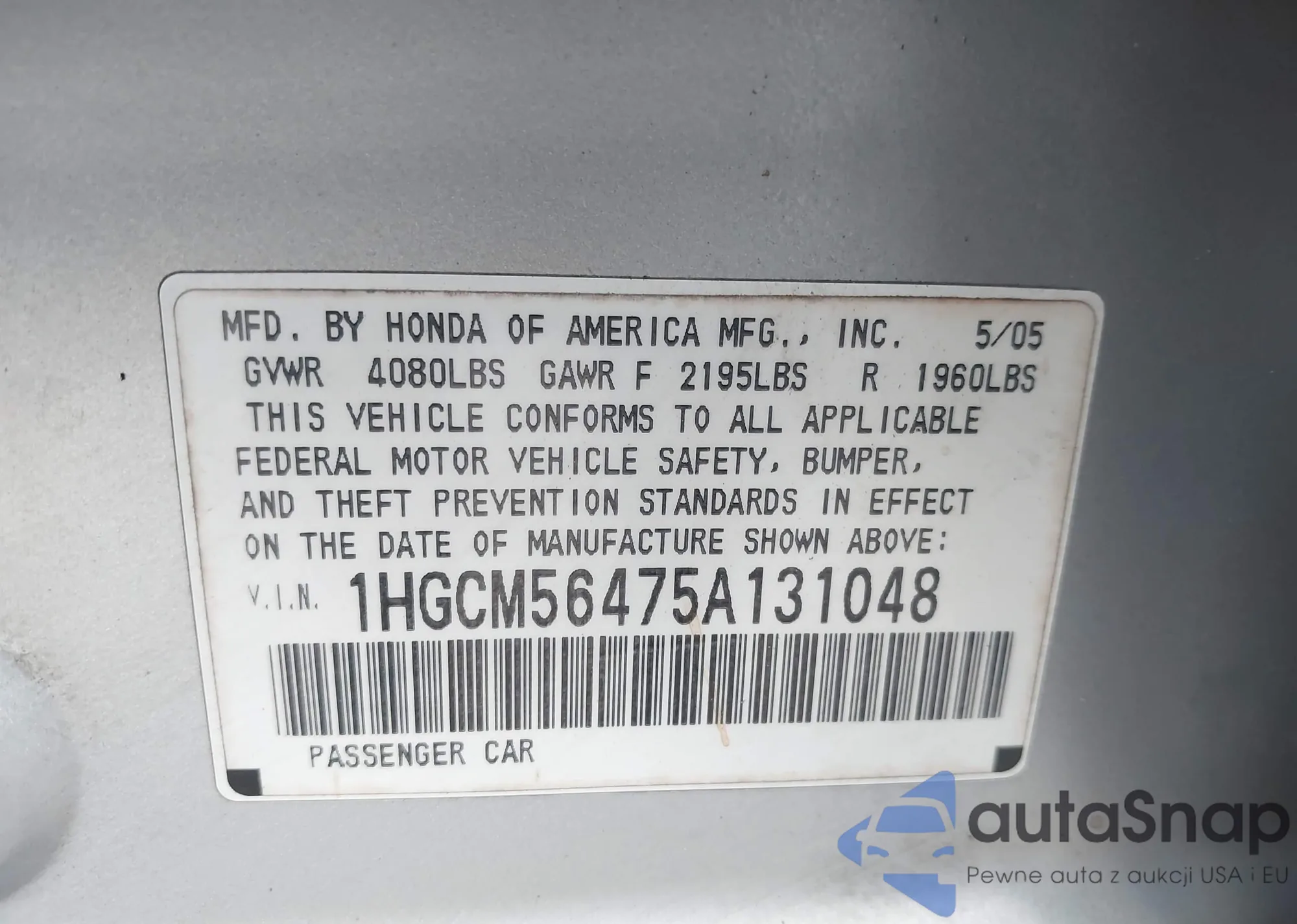 LOT: 43463625 VIN: 1HGCM56475A131048