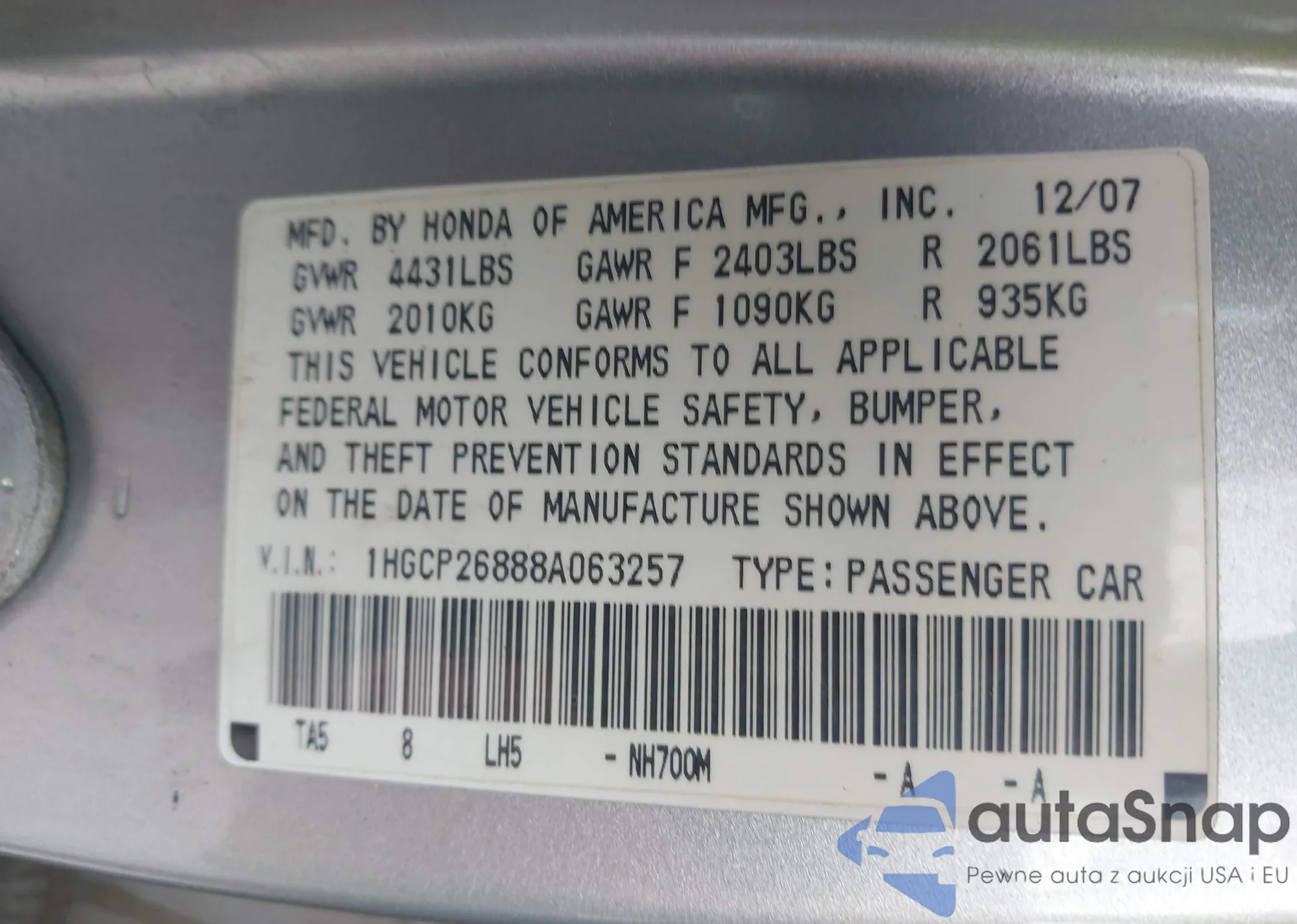 LOT: 43712863 VIN: 1HGFA16518L033729