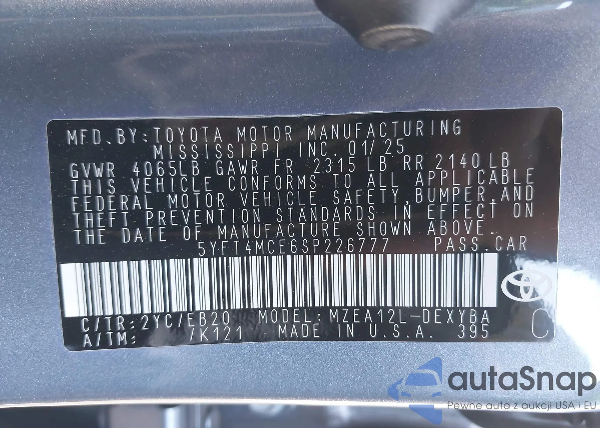 • VIN 5YFT4MCE6SP226777