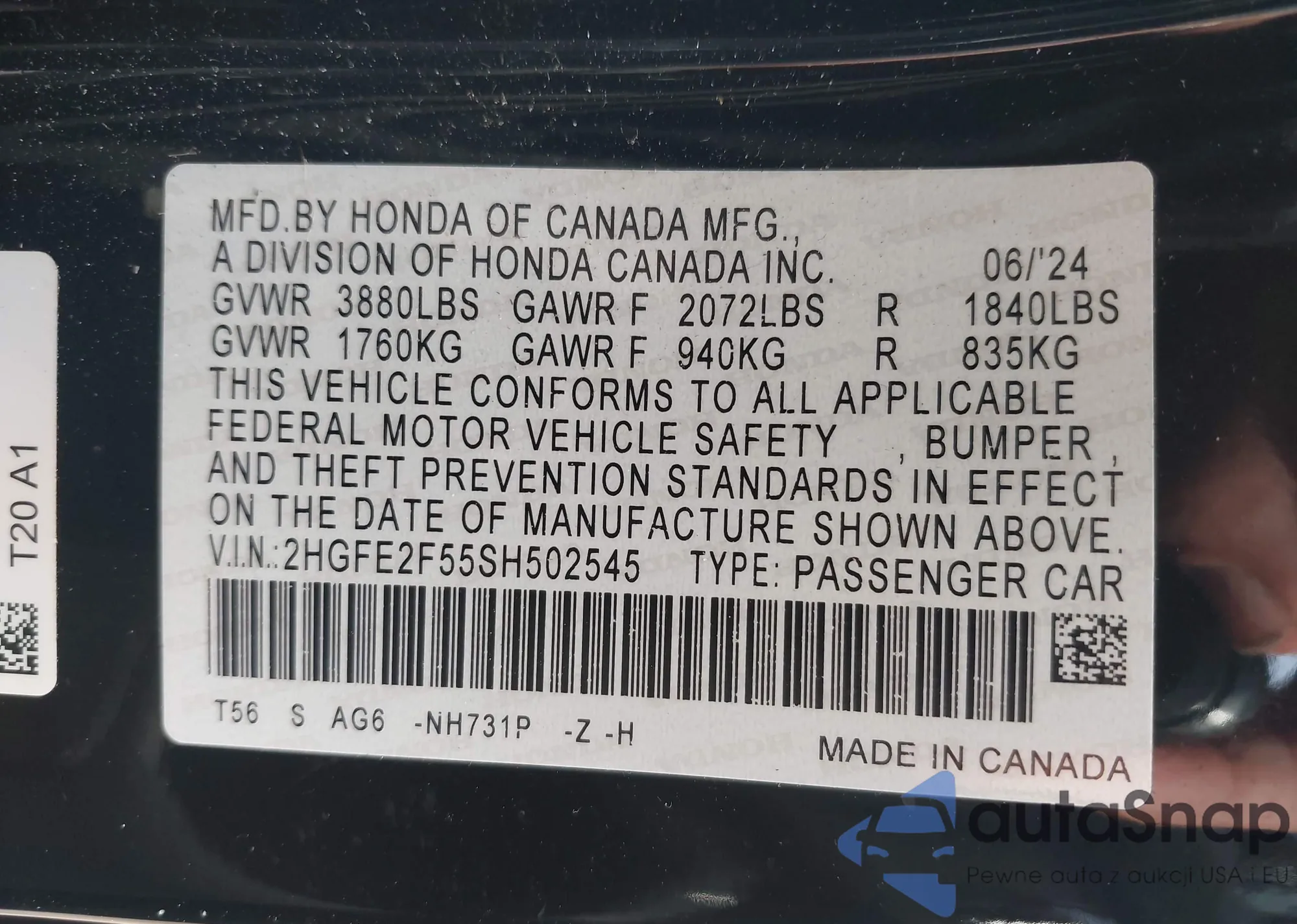 • VIN 2HGFE2F55SH502545