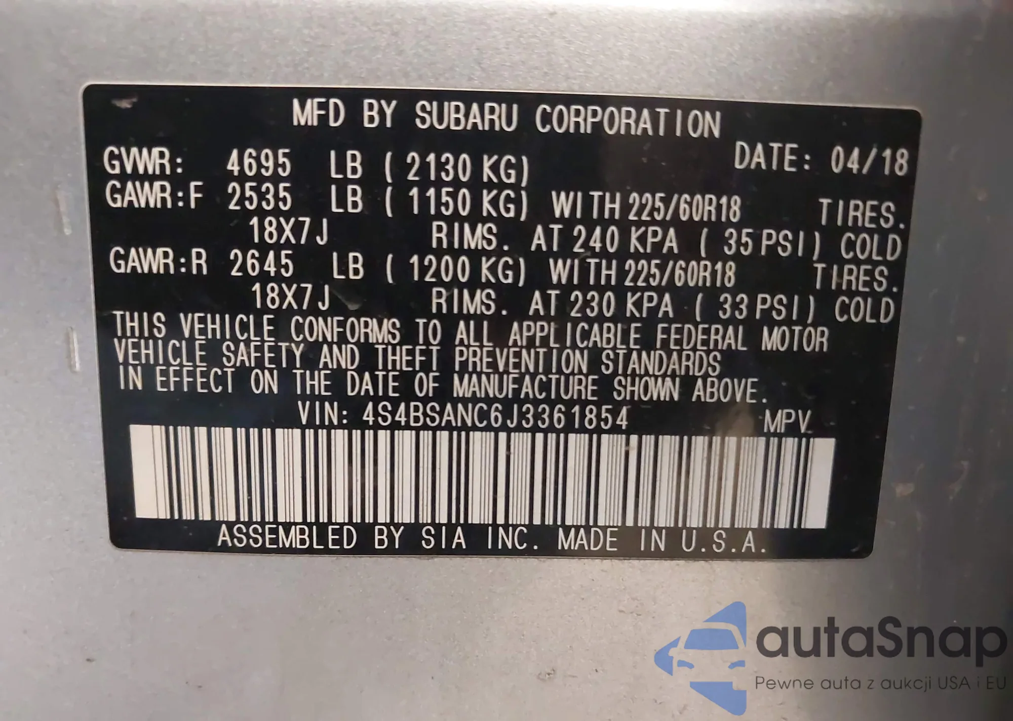 LOT: 42998214 VIN: 4S4BSANC6J3361854