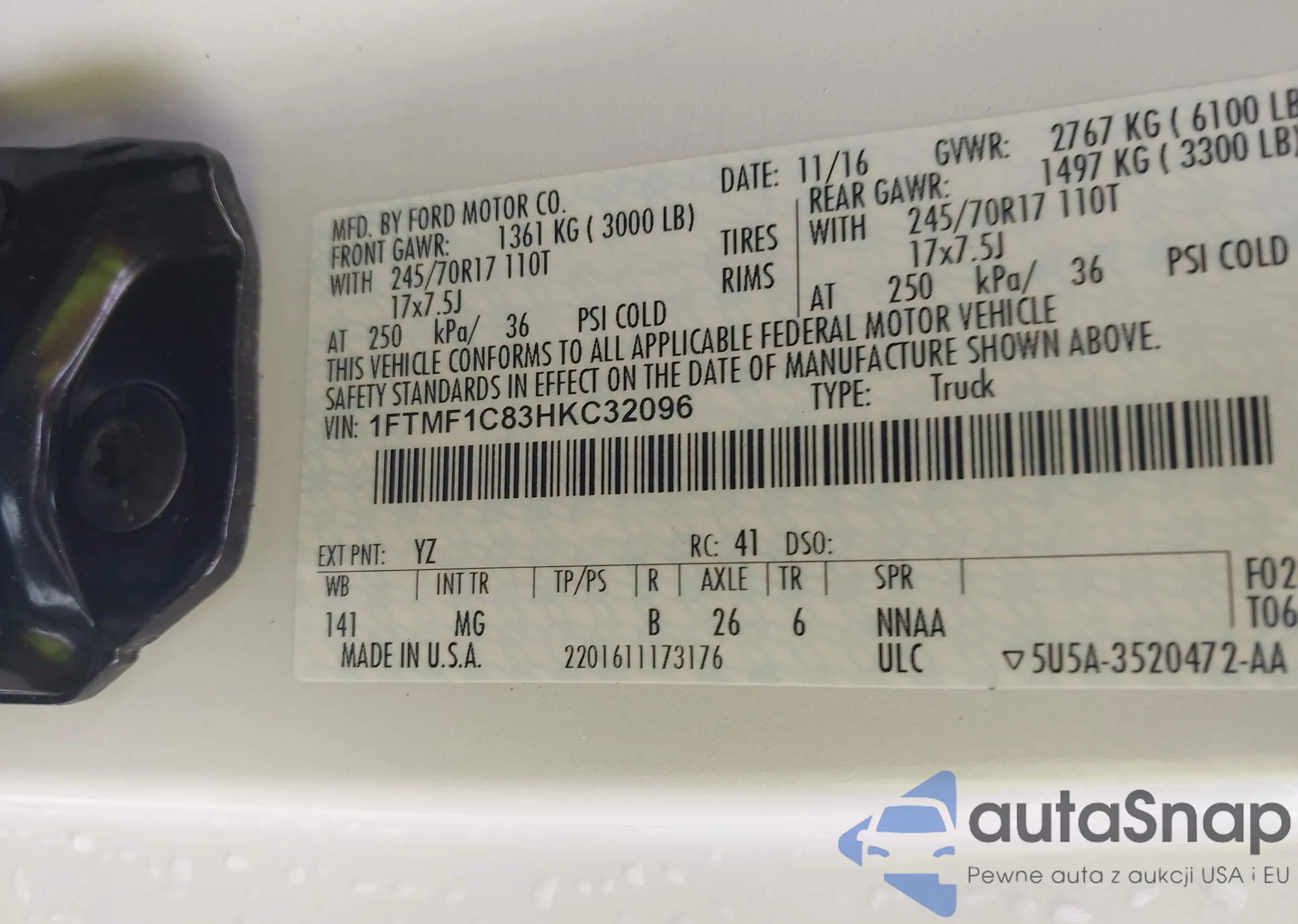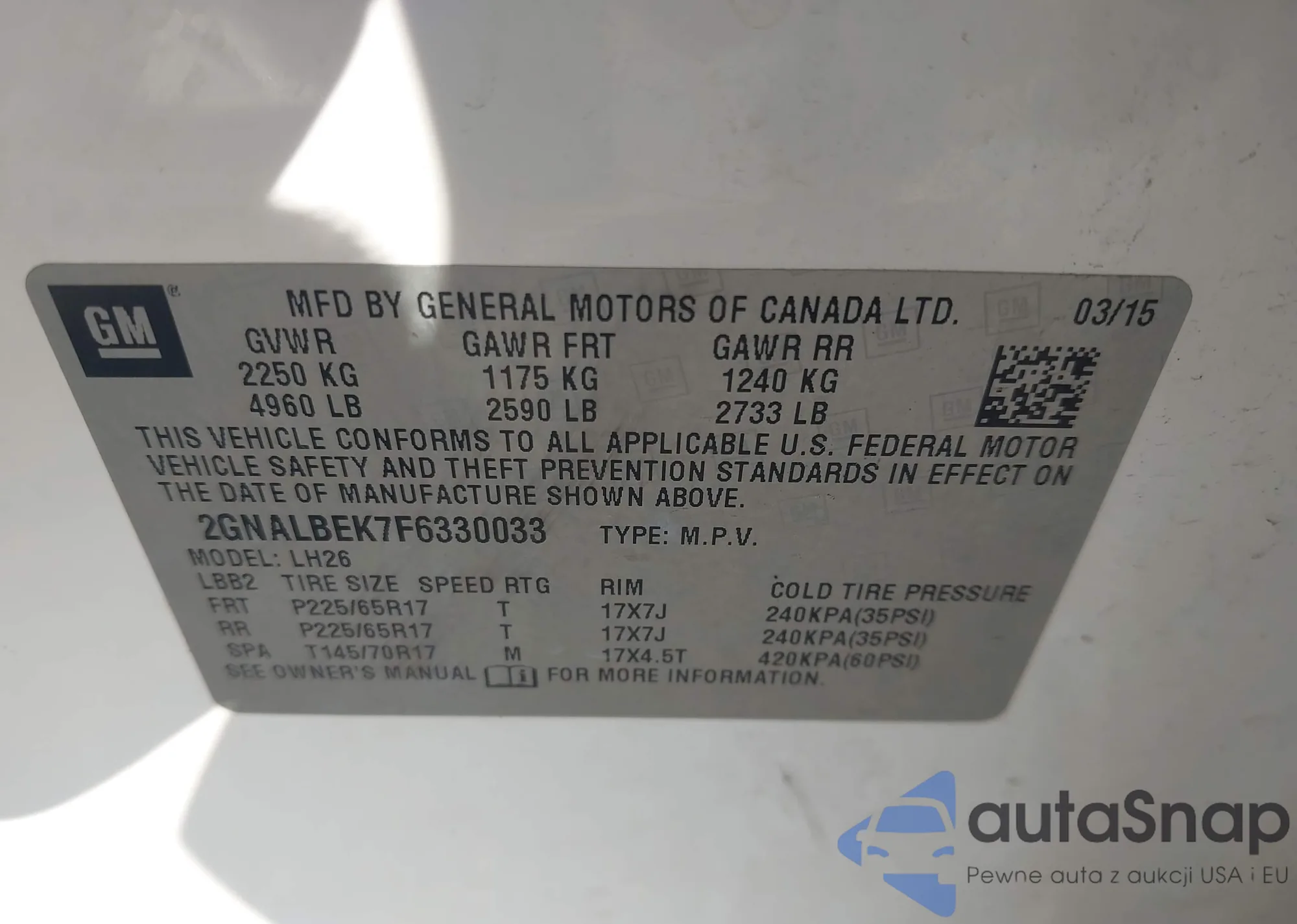 LOT: 43063337 VIN: 6G3F15RW9HL310009