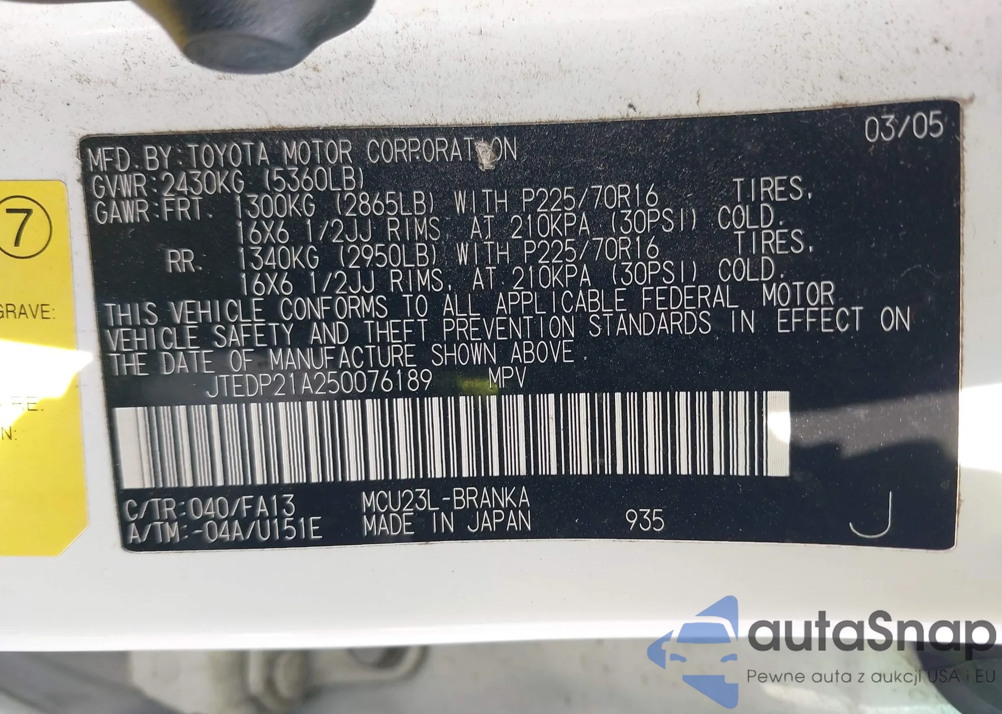LOT: 43304972 VIN: JTEDP21A250076189