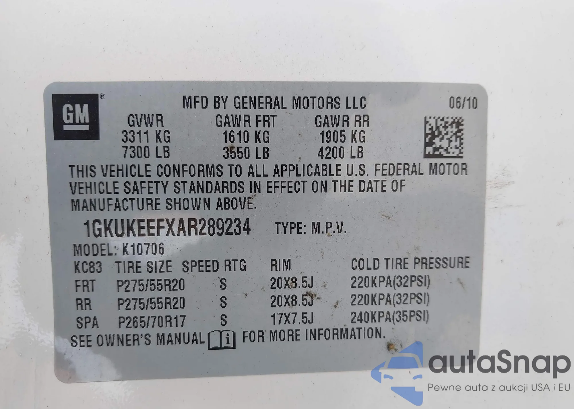 • VIN 1GKUKEEFXAR289234