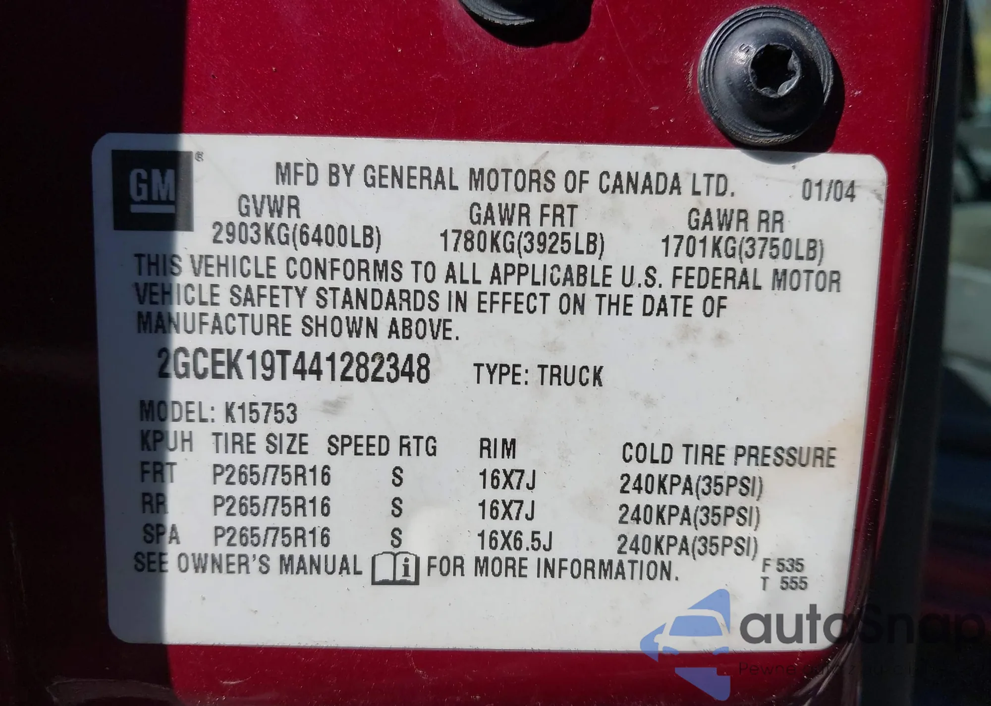 • VIN 2GCEK19T441282348