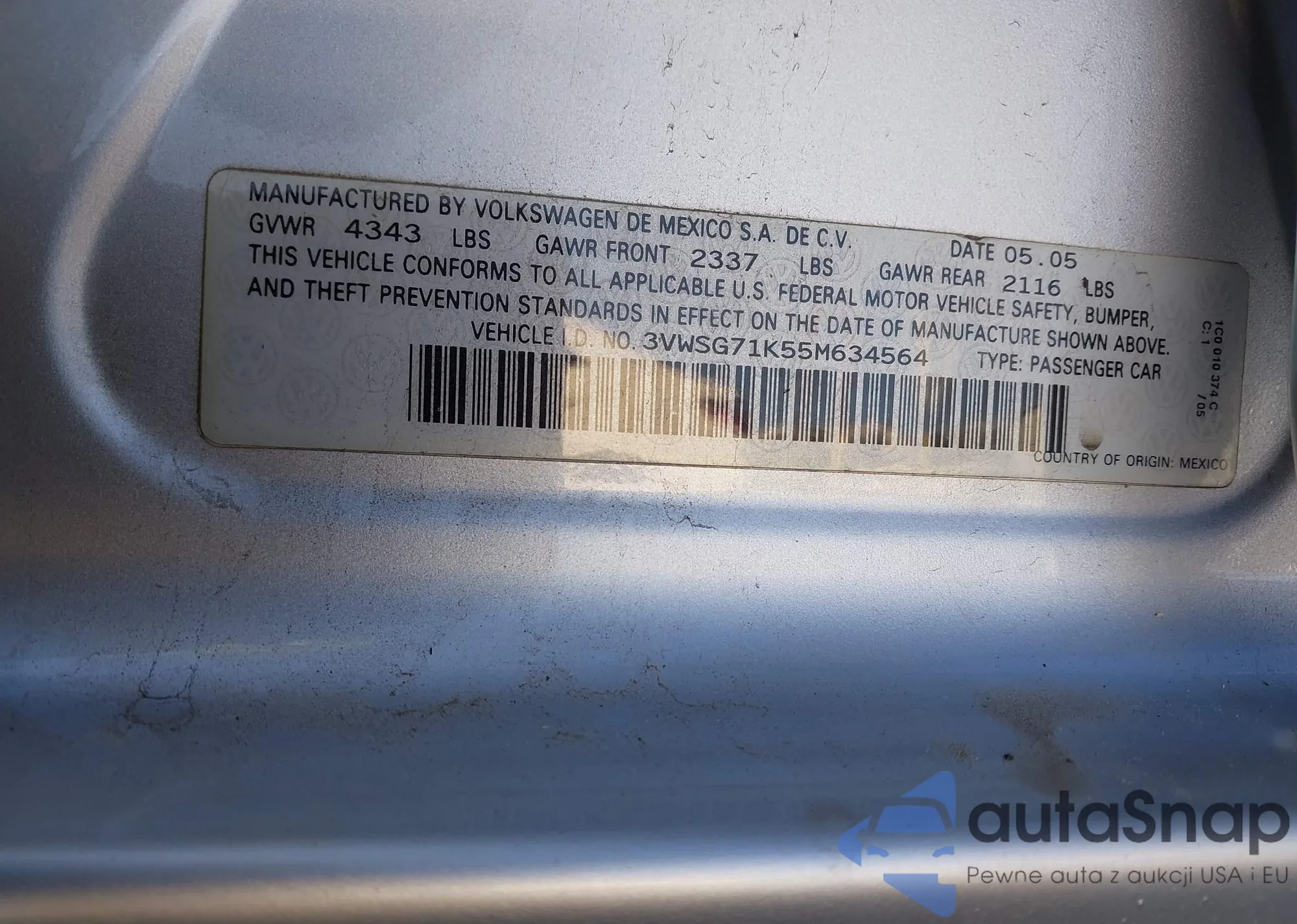 • VIN 3VWSG71K55M634564