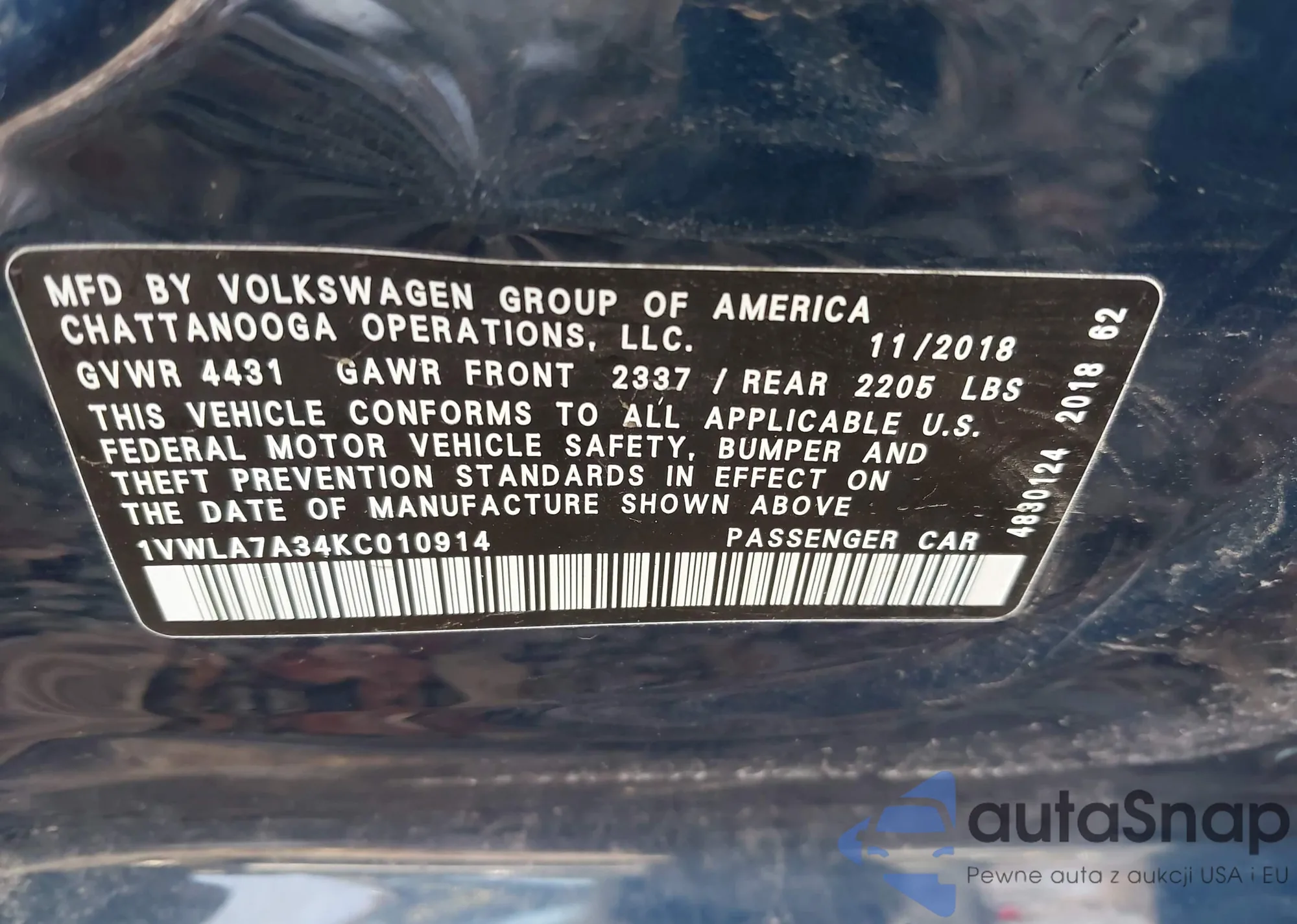 LOT: 43661042 VIN: 1VWLA7A34KC010914