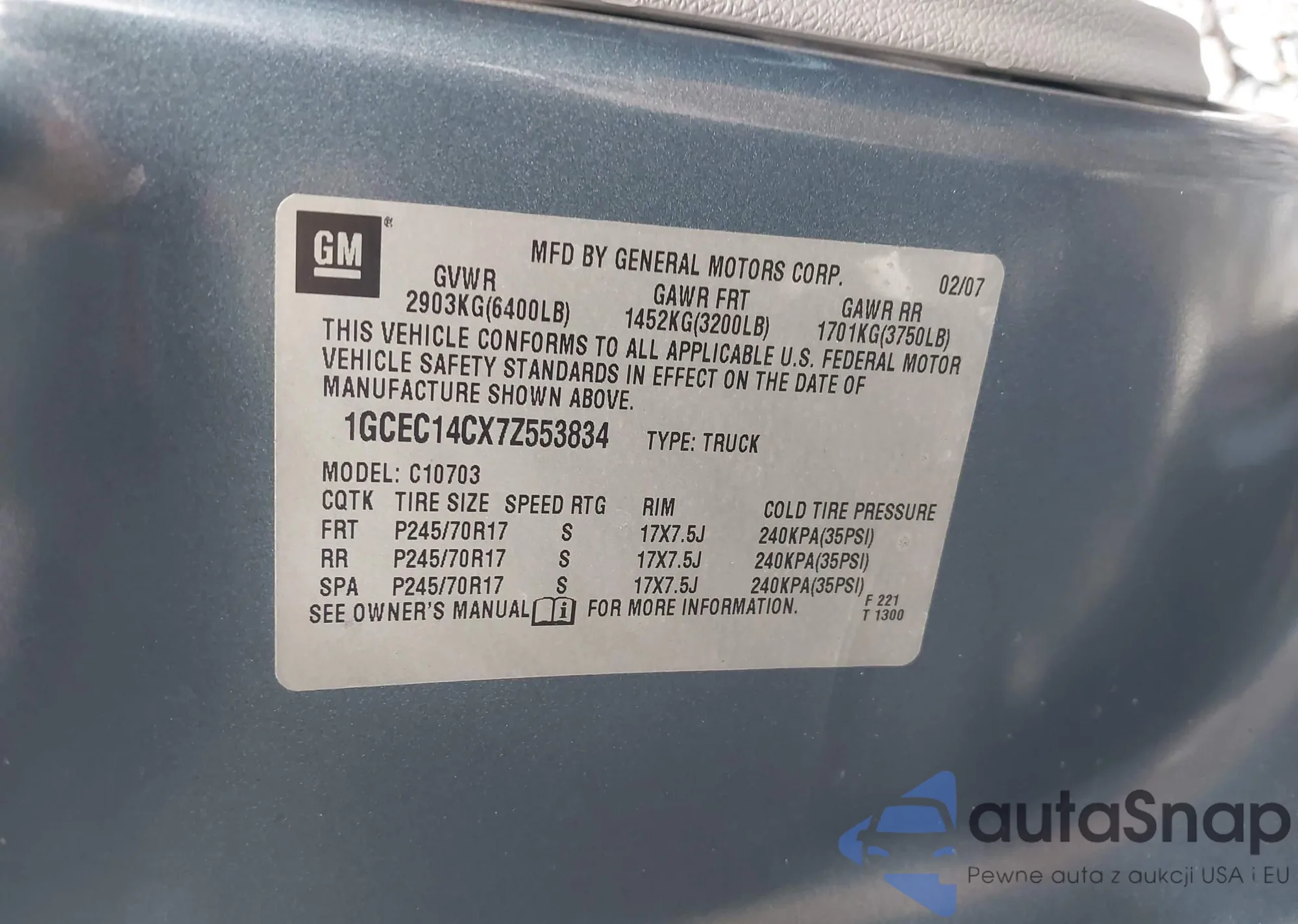 • VIN 1GCEC14CX7Z553834