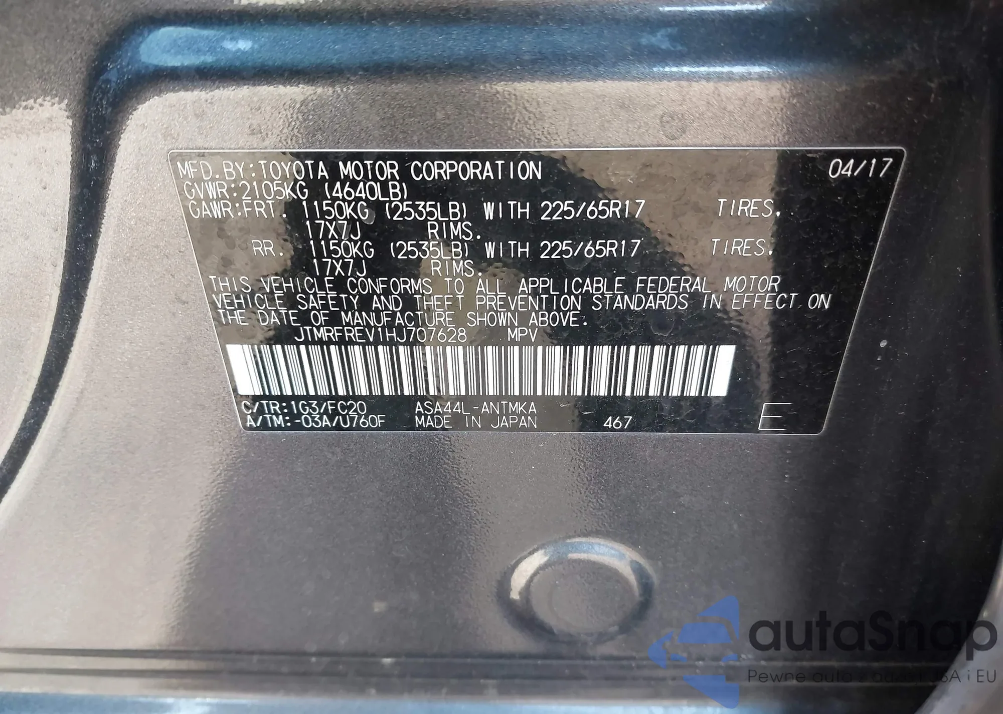LOT: 43614904 VIN: JTMRFREV1HJ707628