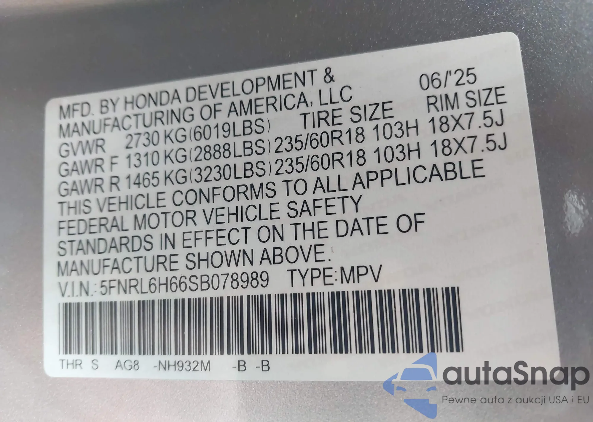 • VIN 5FNYF4H43CB041096