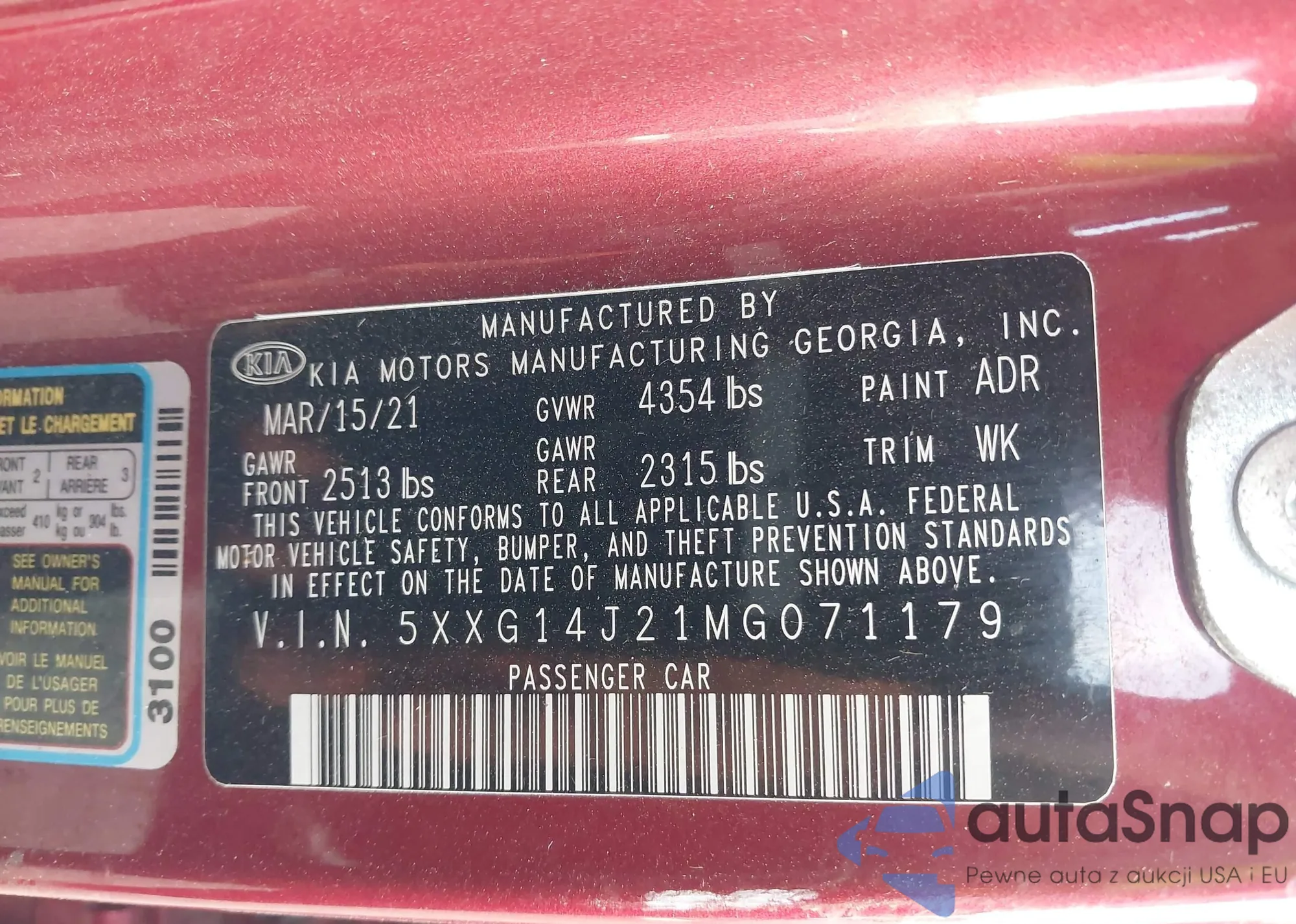 LOT: 43314407 VIN: 5XXG14J21MG071179