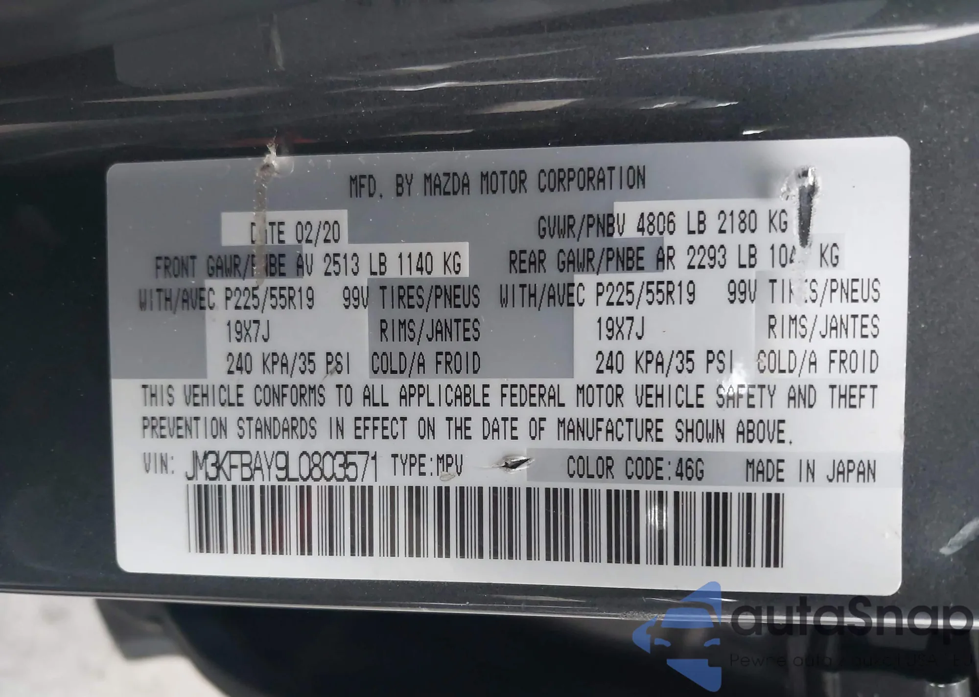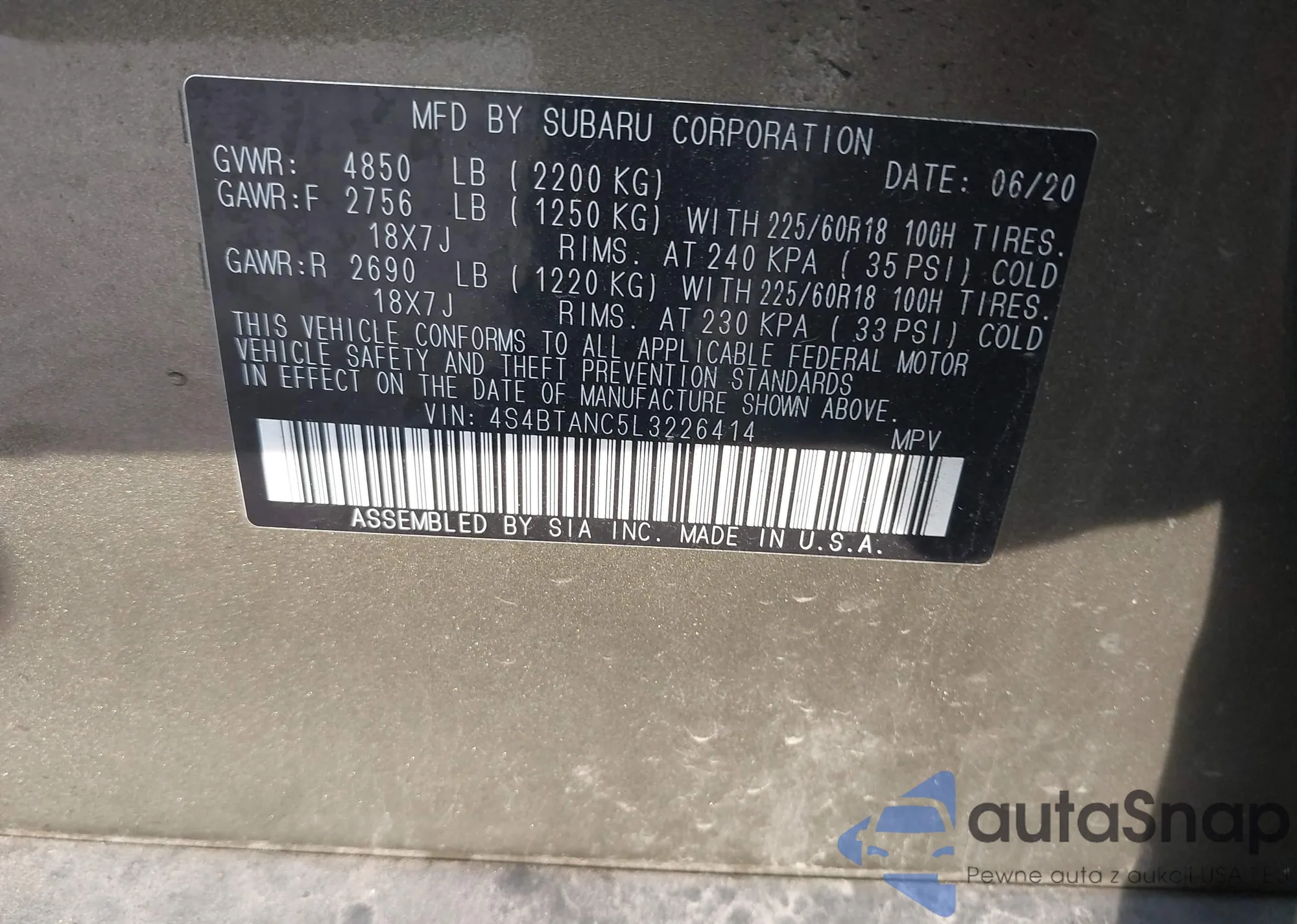 LOT: 43610527 VIN: 4S4BTANC5L3226414
