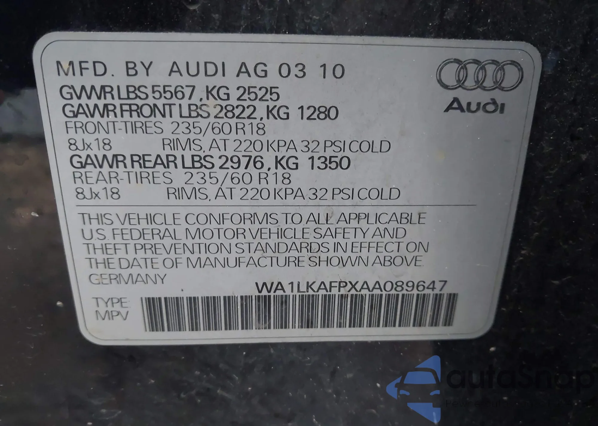 LOT: 43702231 VIN: WA1LKAFPXAA089647