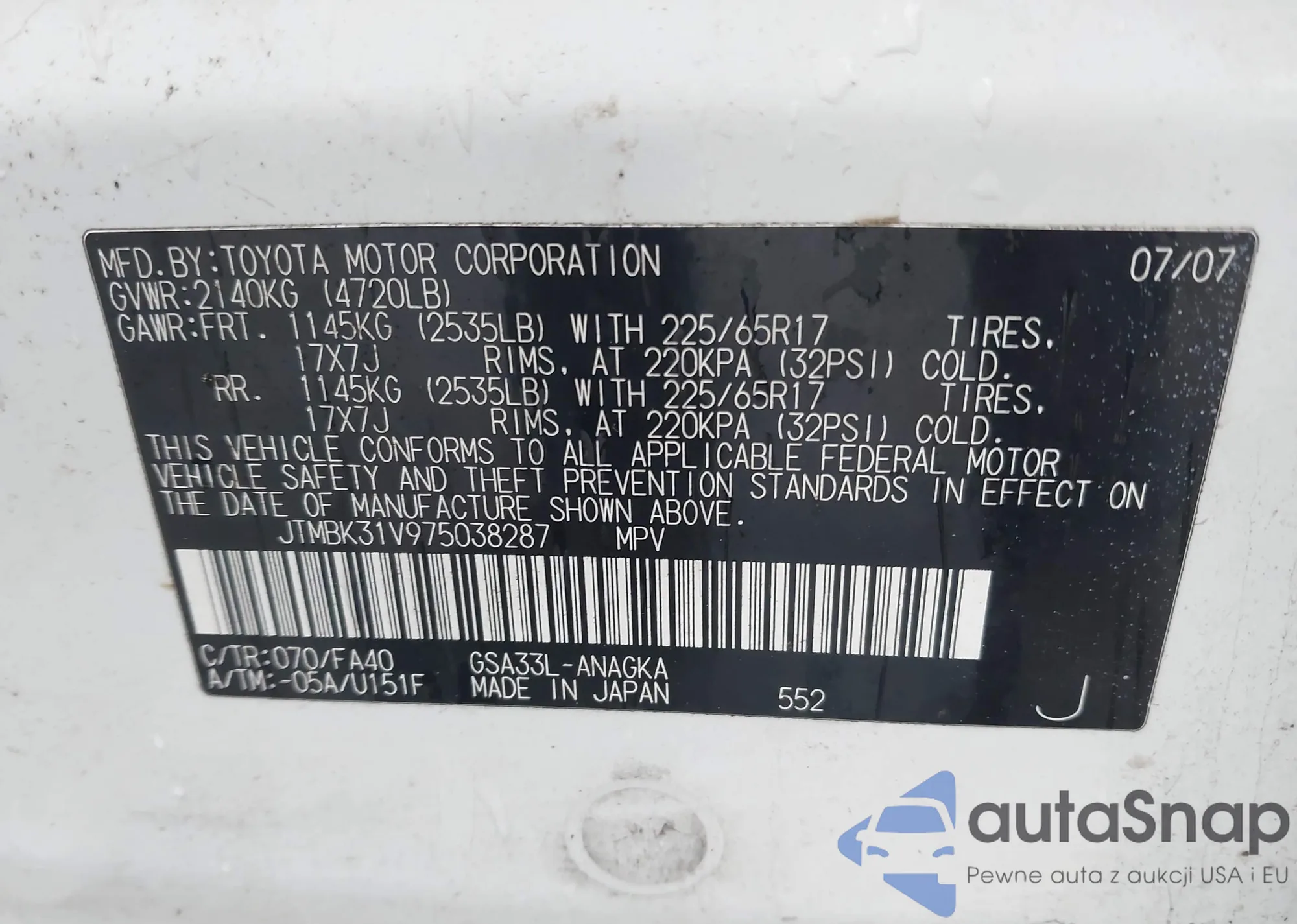LOT: 43787470 VIN: JTMBK31V975038287