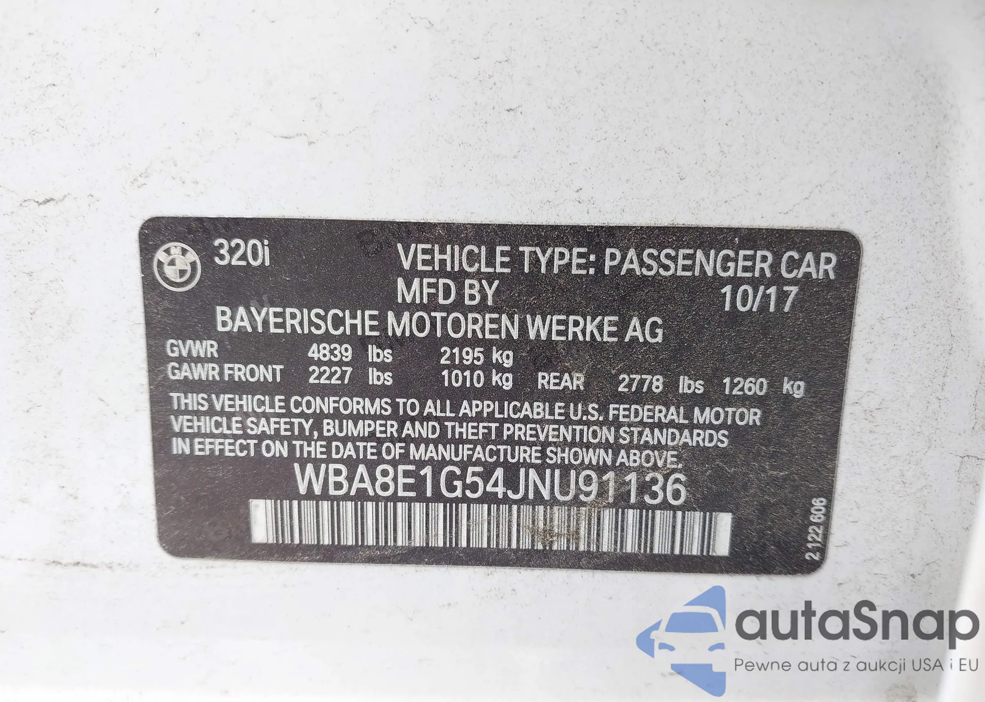 LOT: 43126790 VIN: WBA8E1G54JNU91136