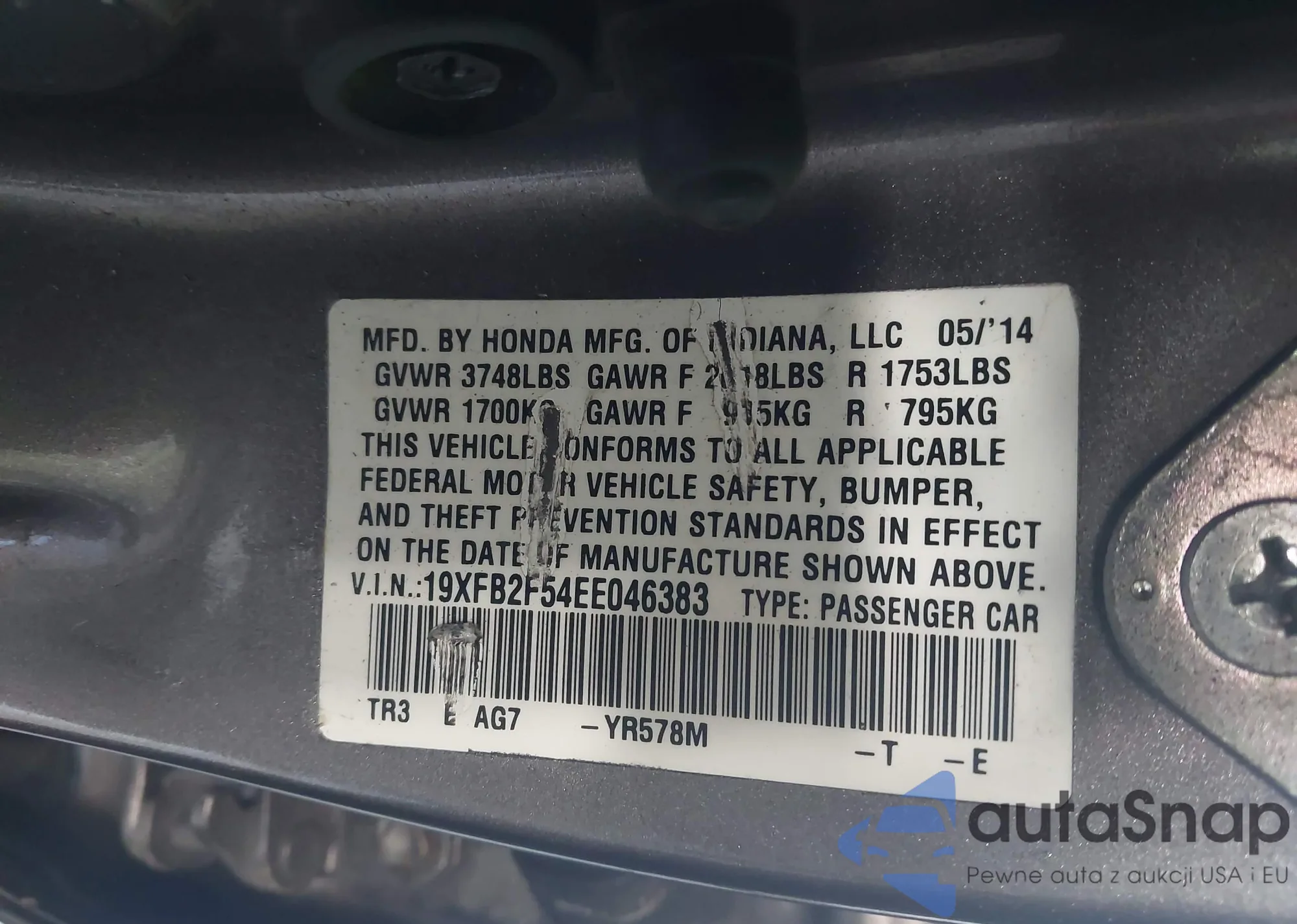 LOT: 43416888 VIN: 2HGFE2F51SH538281