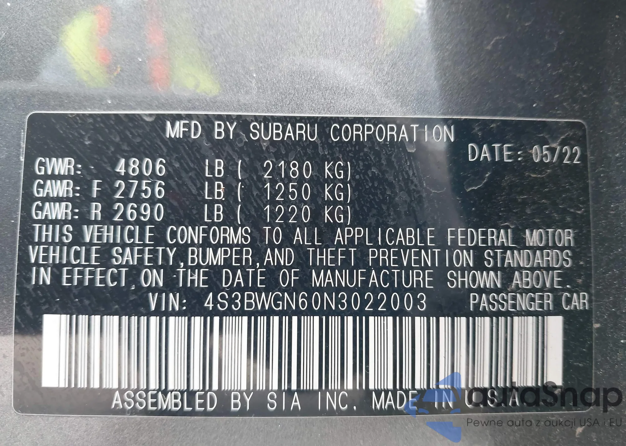 • VIN 4S3BWGN60N3022003