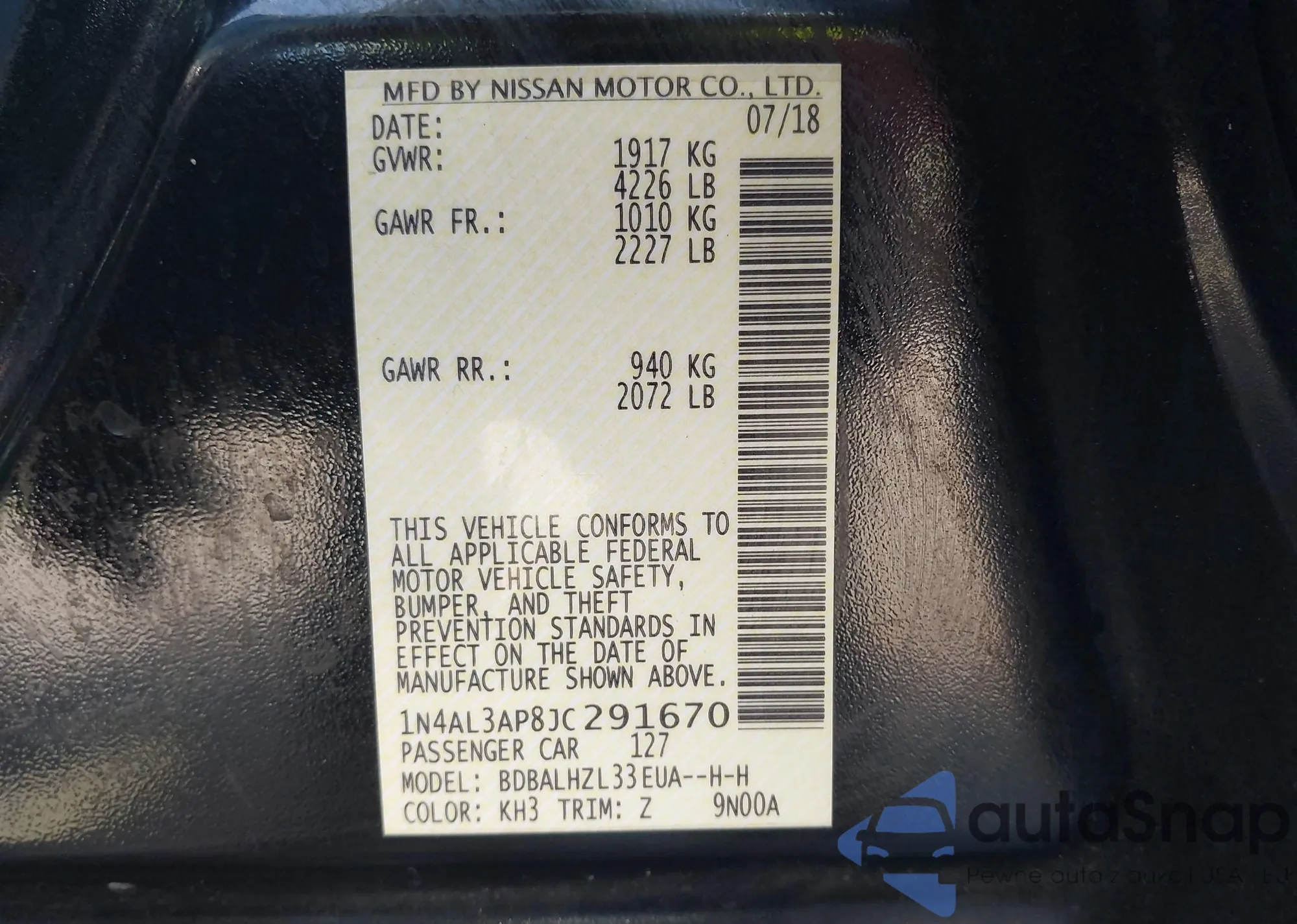• VIN 1N4AL3AP8JC291670
