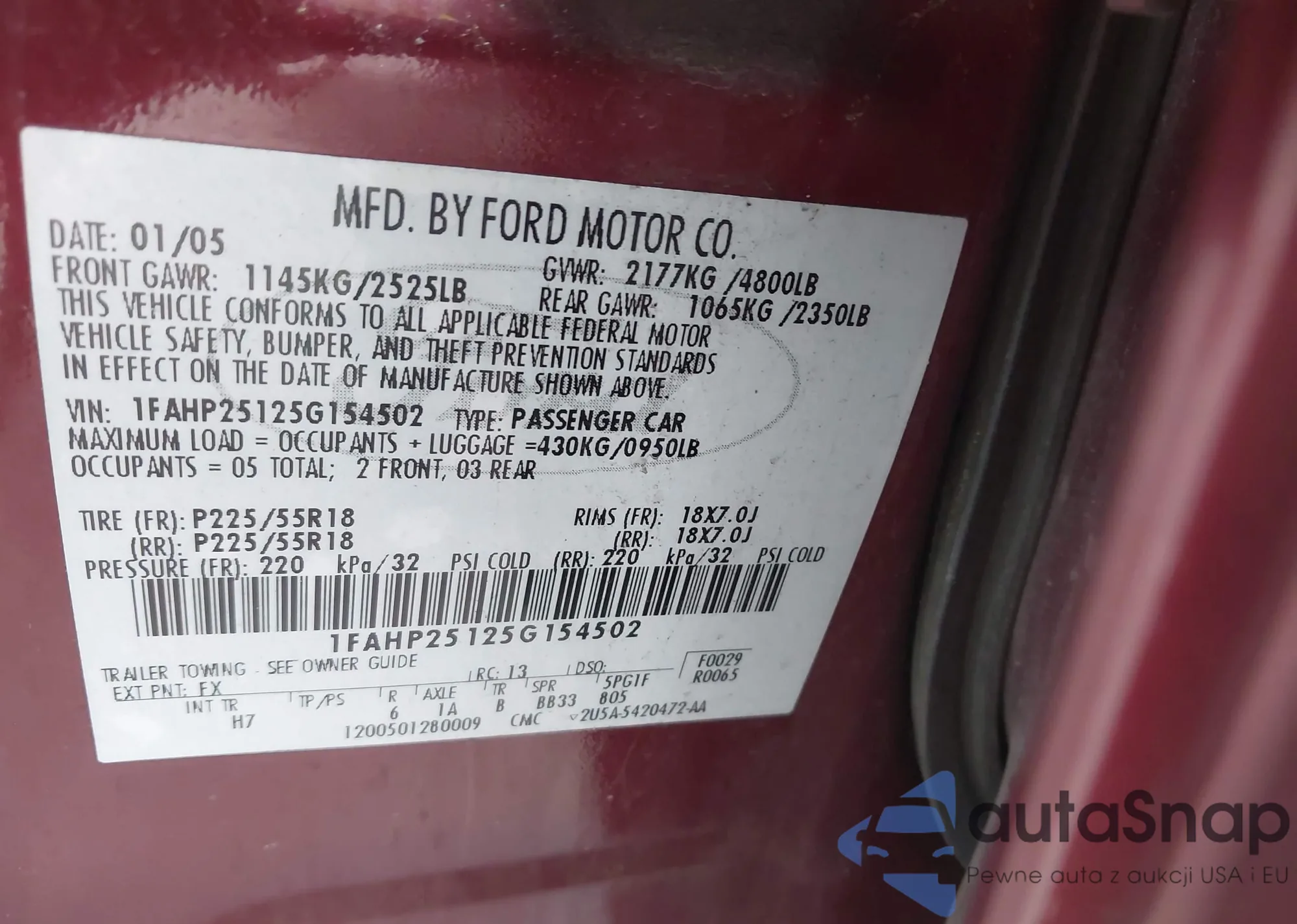 • VIN 1FAHP25125G154502