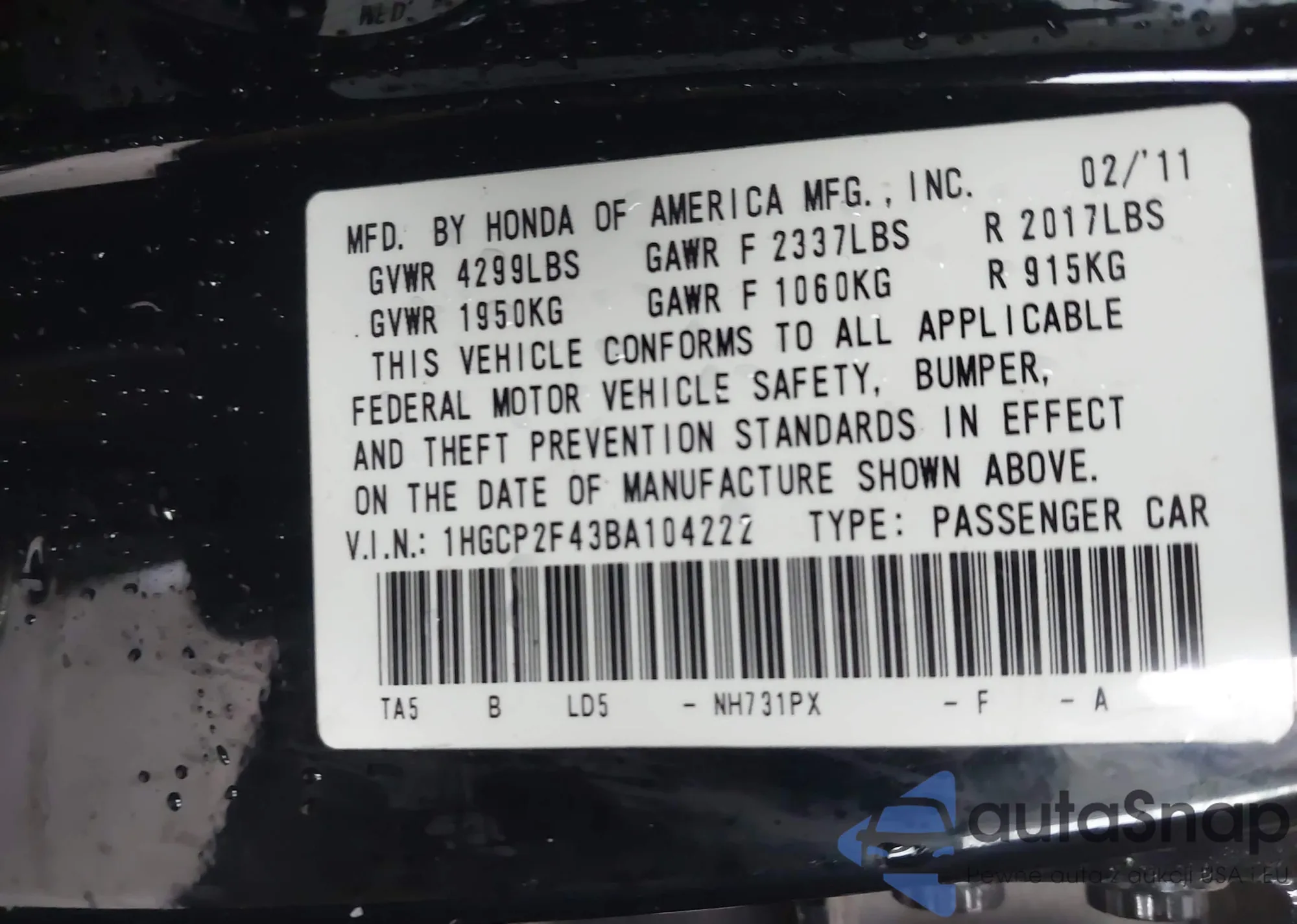LOT: 43649173 VIN: 19XFL2H81NE001521