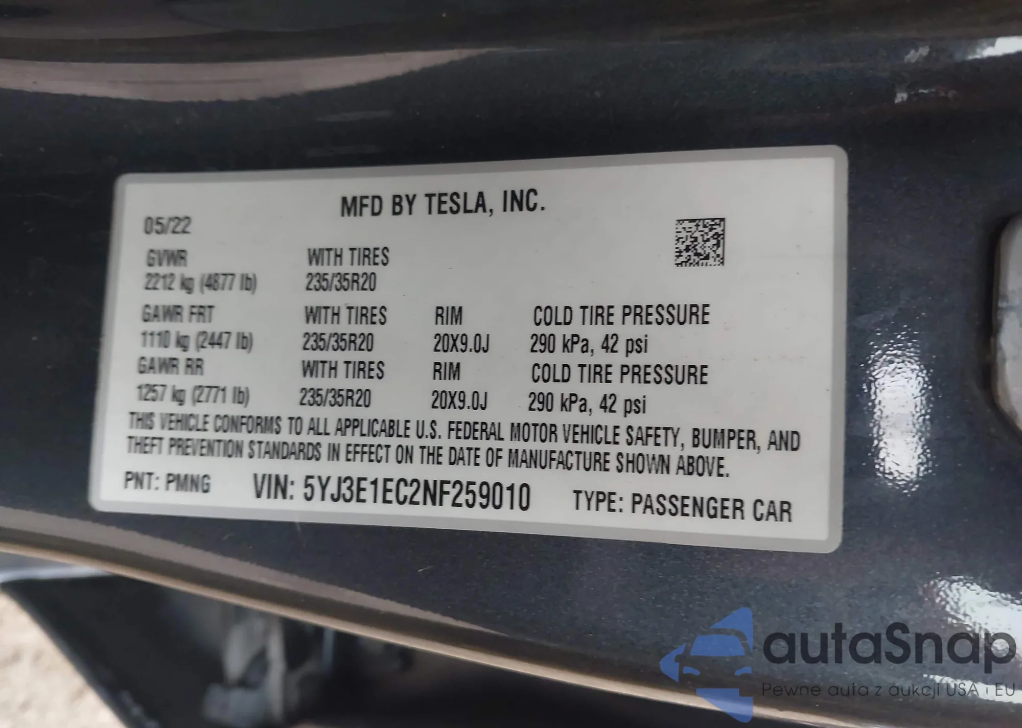 LOT: 43705331 VIN: 5YJ3E1EC2NF259010