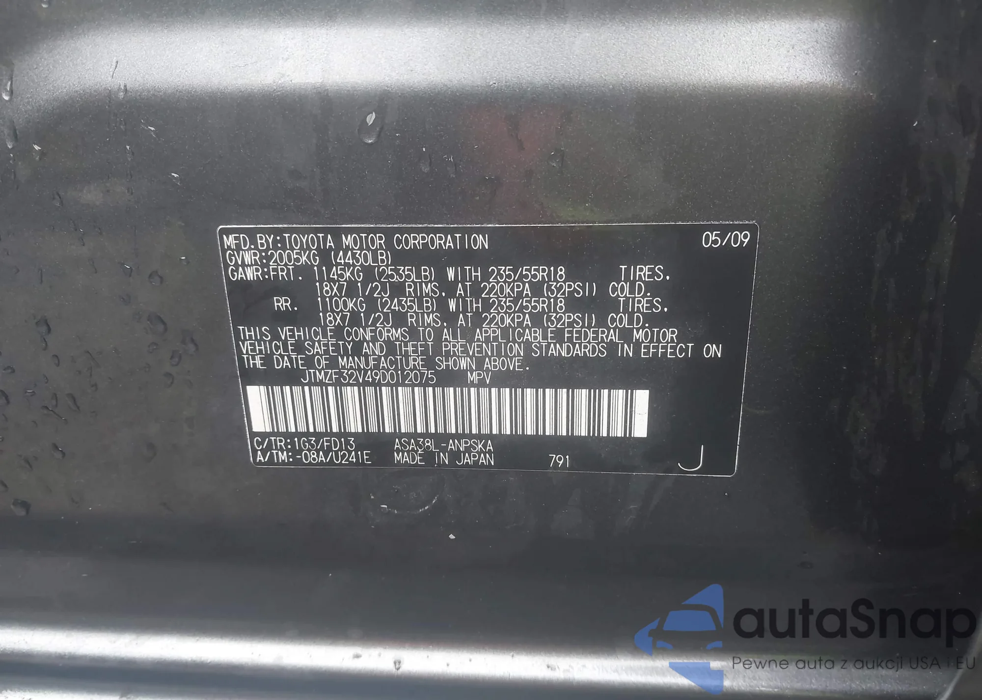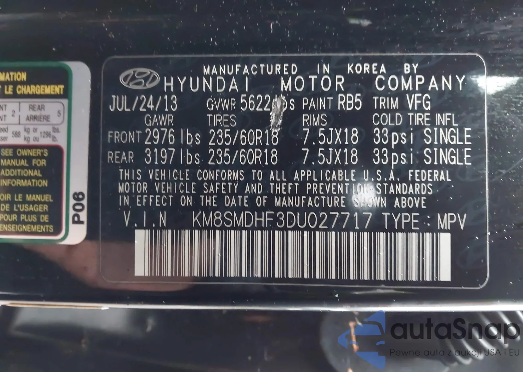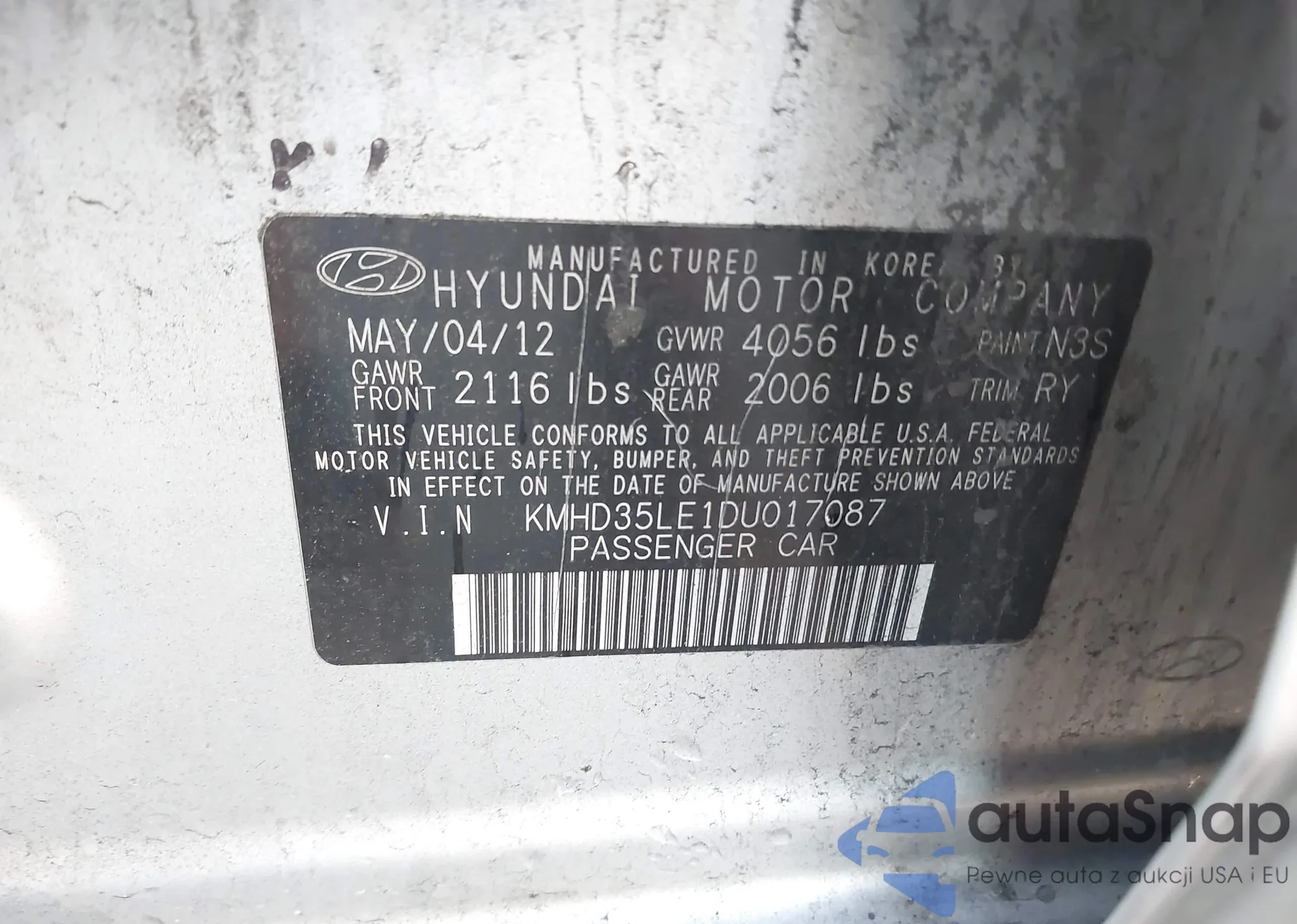 LOT: 43611345 VIN: KMHD35LE1DU017087