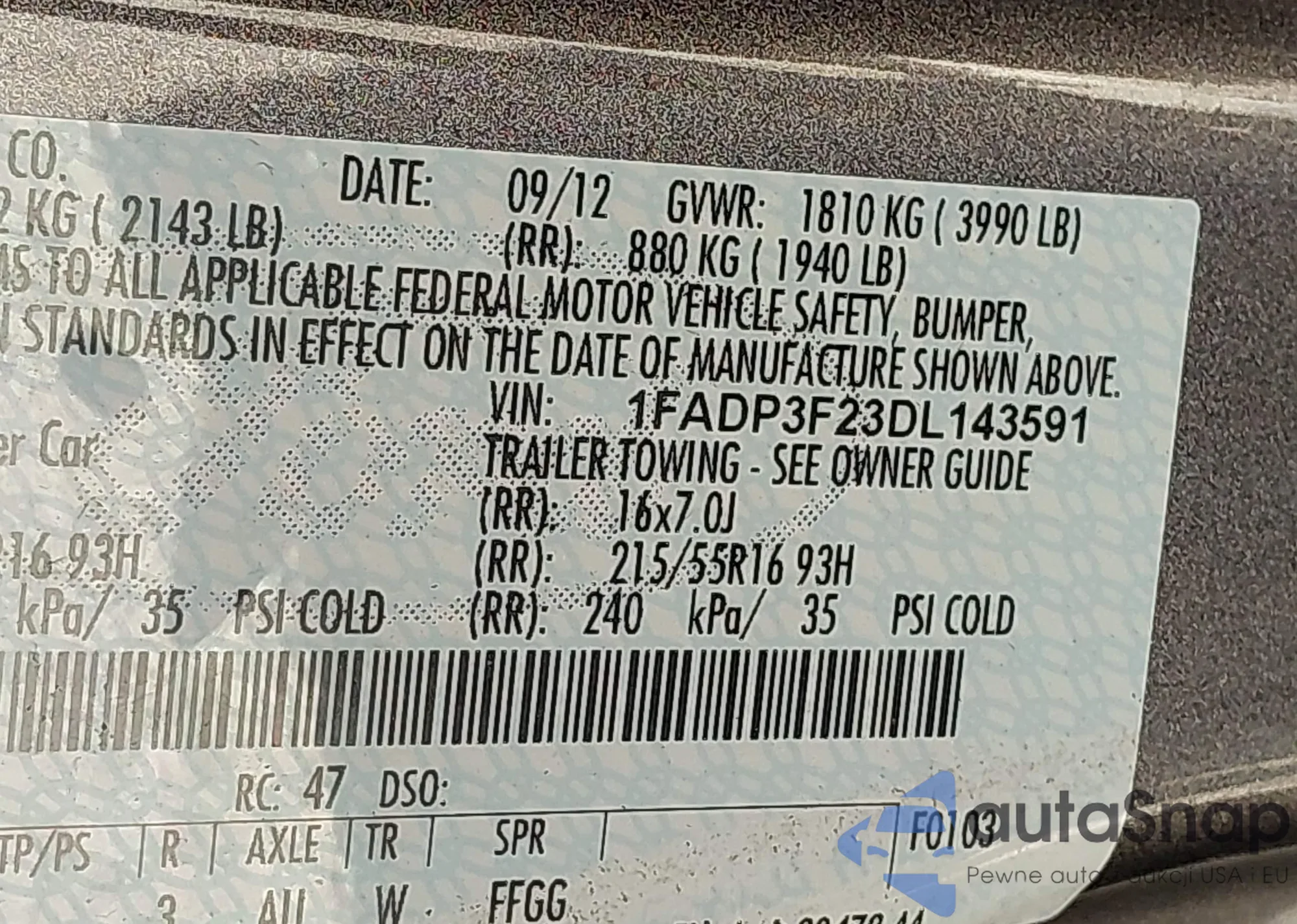 • VIN 1FADP3F23DL143591