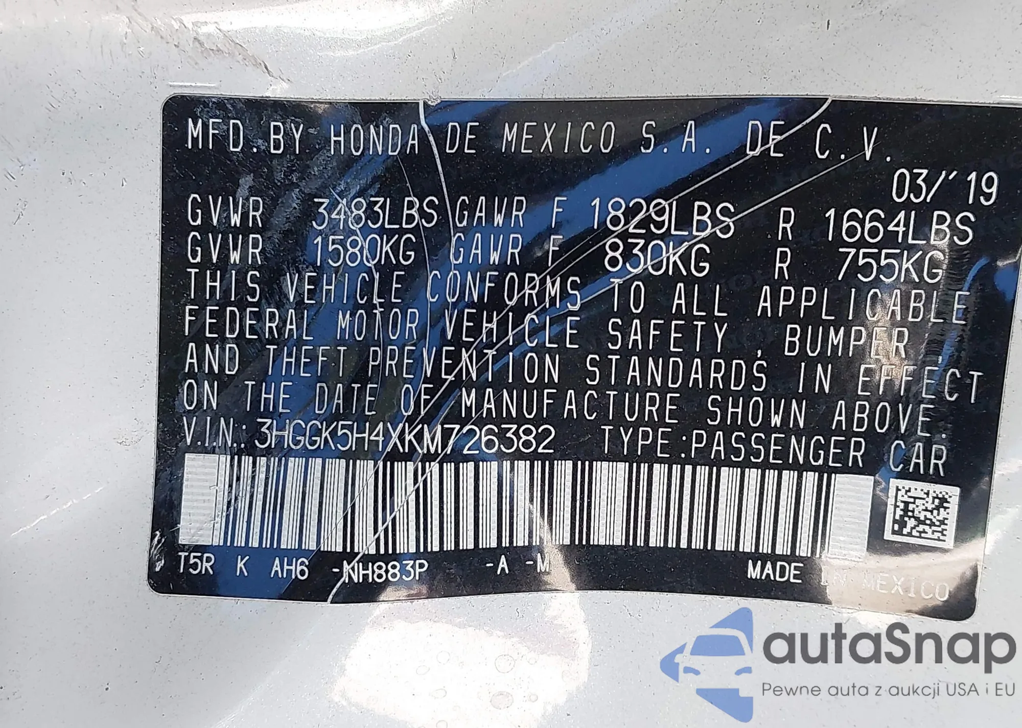 LOT: 43618720 VIN: 3HGGK5H4XKM726382