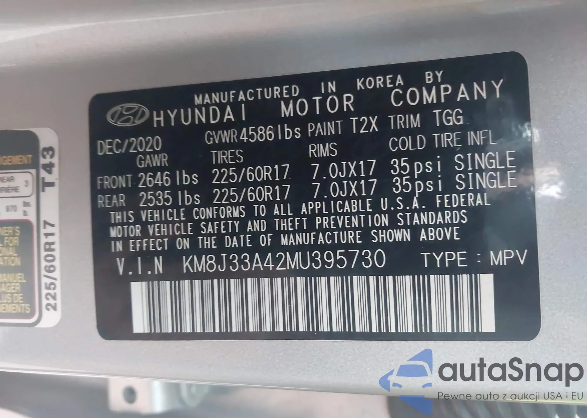 LOT: 43666503 VIN: KM8J33A42MU395730