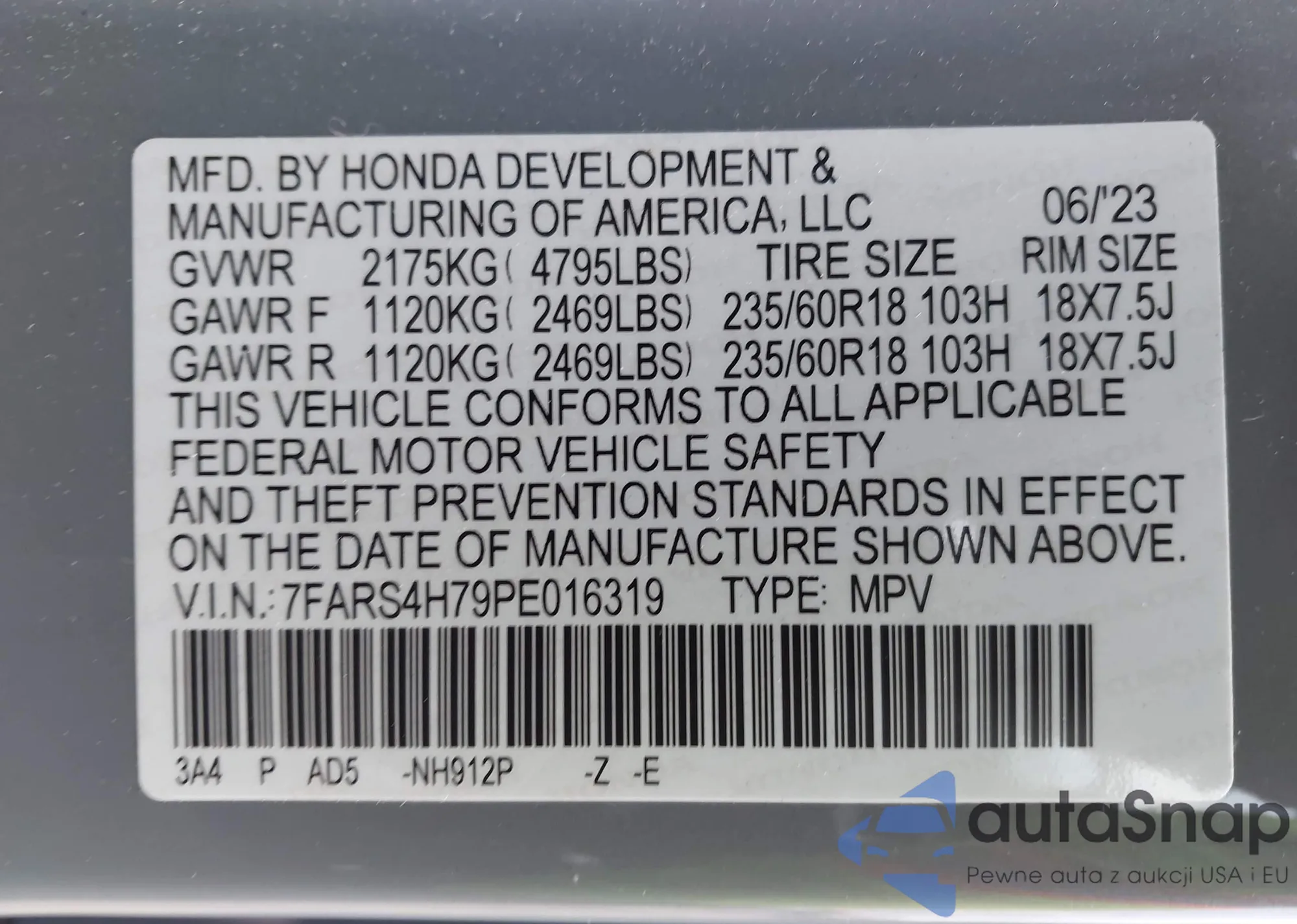 LOT: 43870923 VIN: JHMEJ6675VS029045