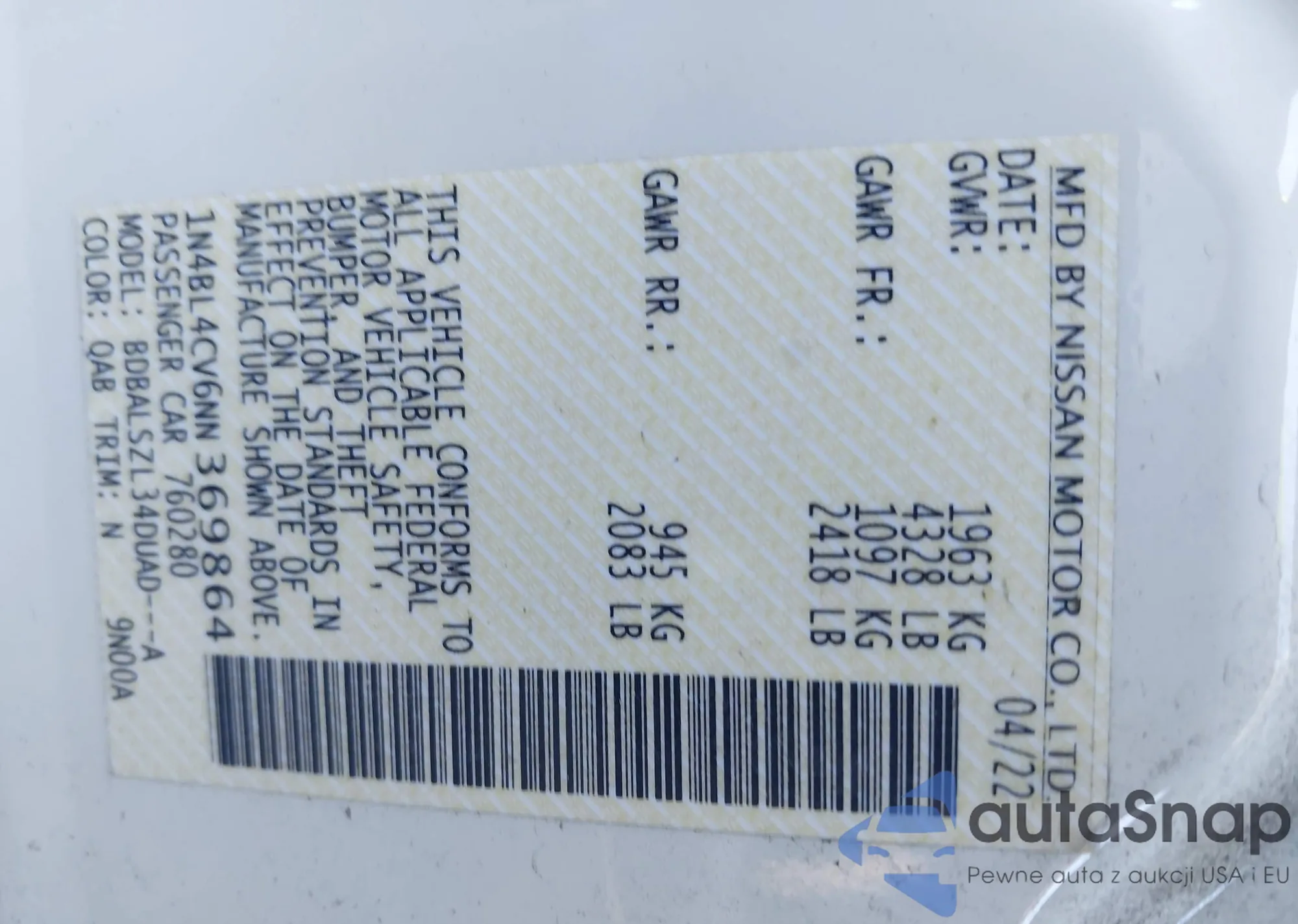 LOT: 43609566 VIN: 1N4BL4CV6NN369864