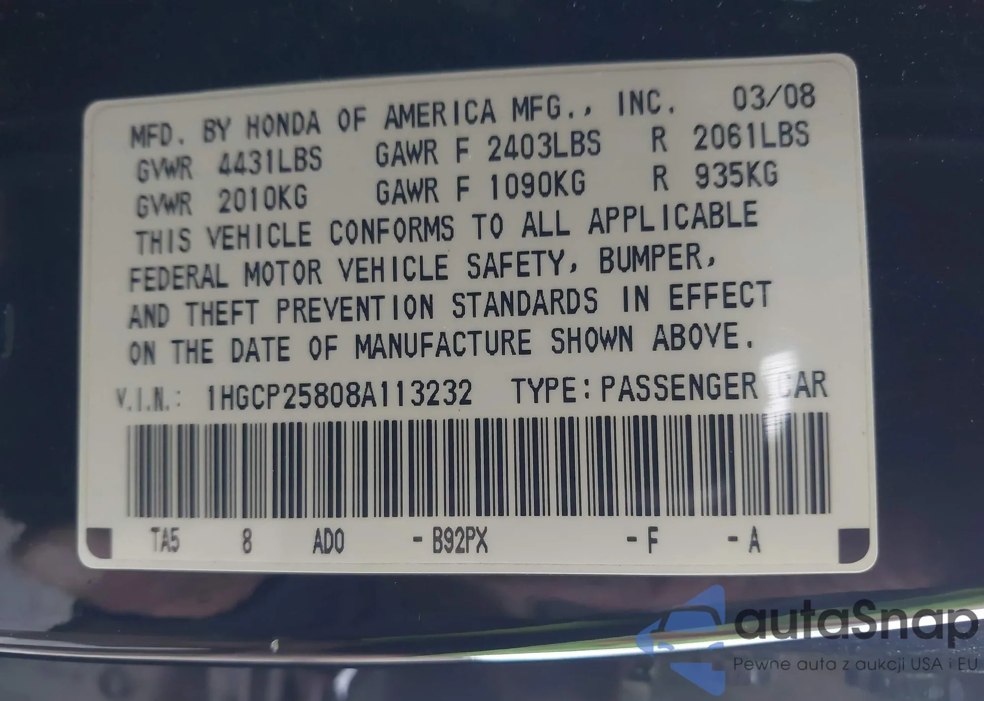 2008 Honda Accord Sdn 2.4 Ex-L/Ex-L from USA, damaged, VIN 1HGCP25808A113232
