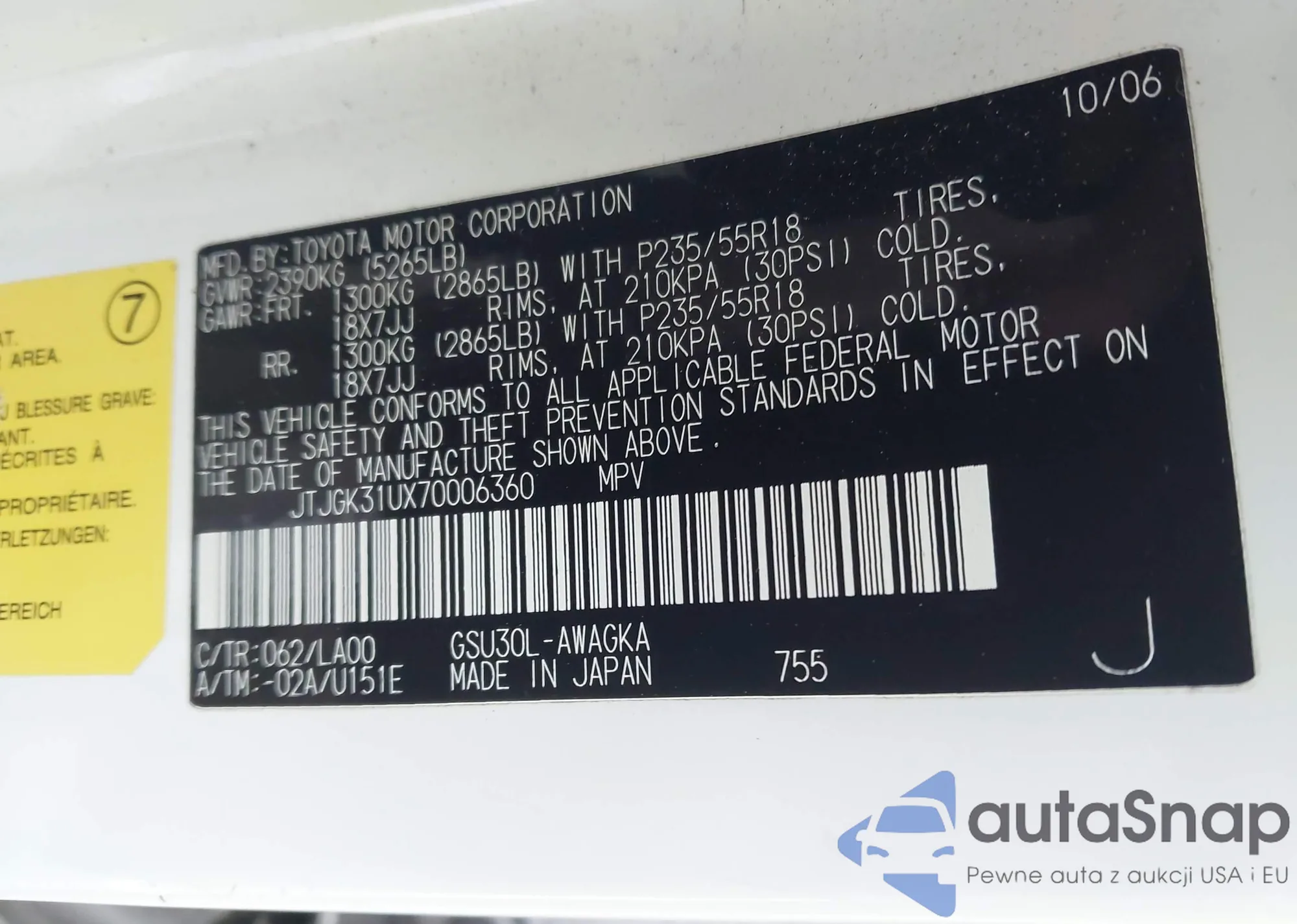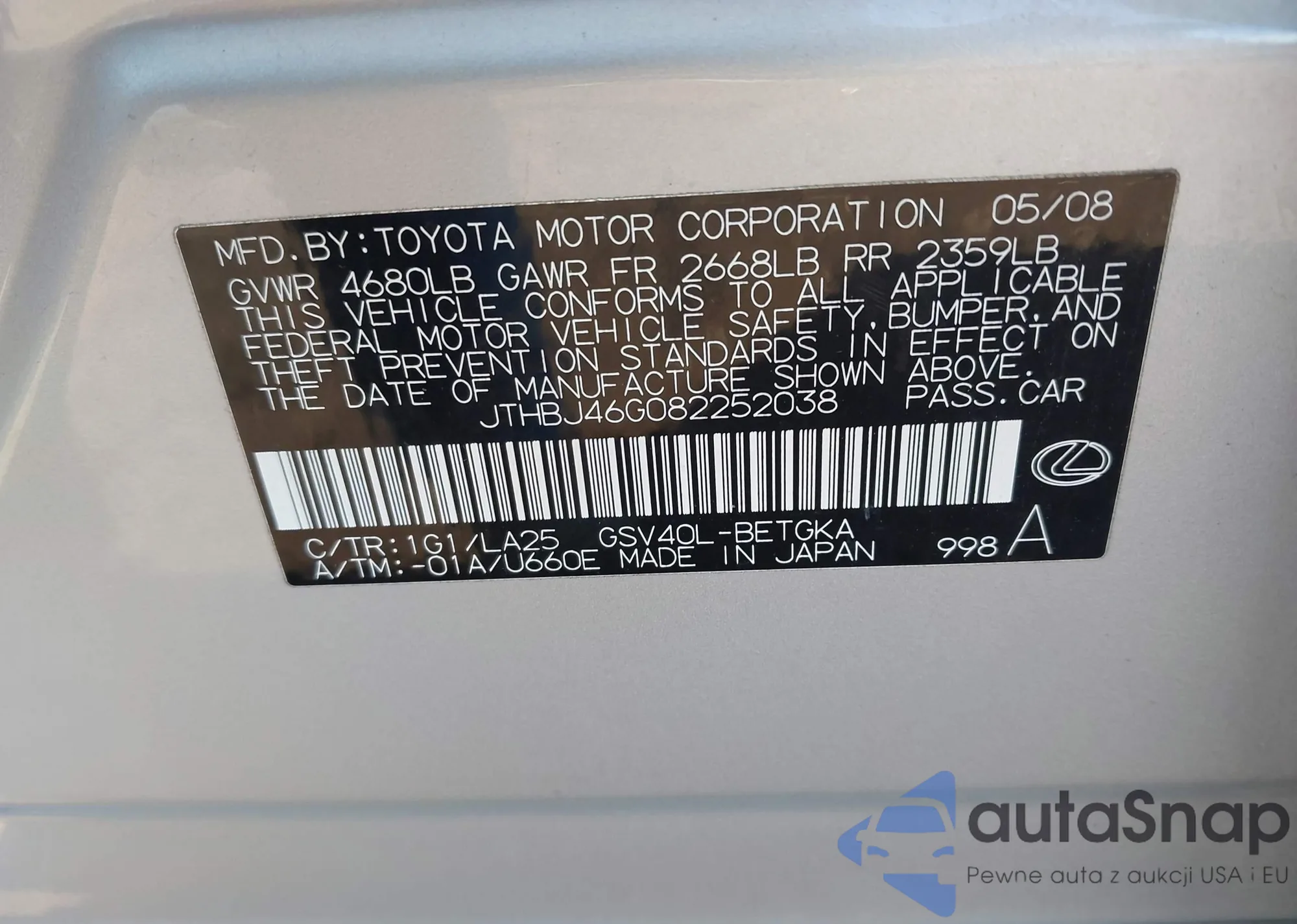 LOT: 43735401 VIN: JTHBJ46G082252038
