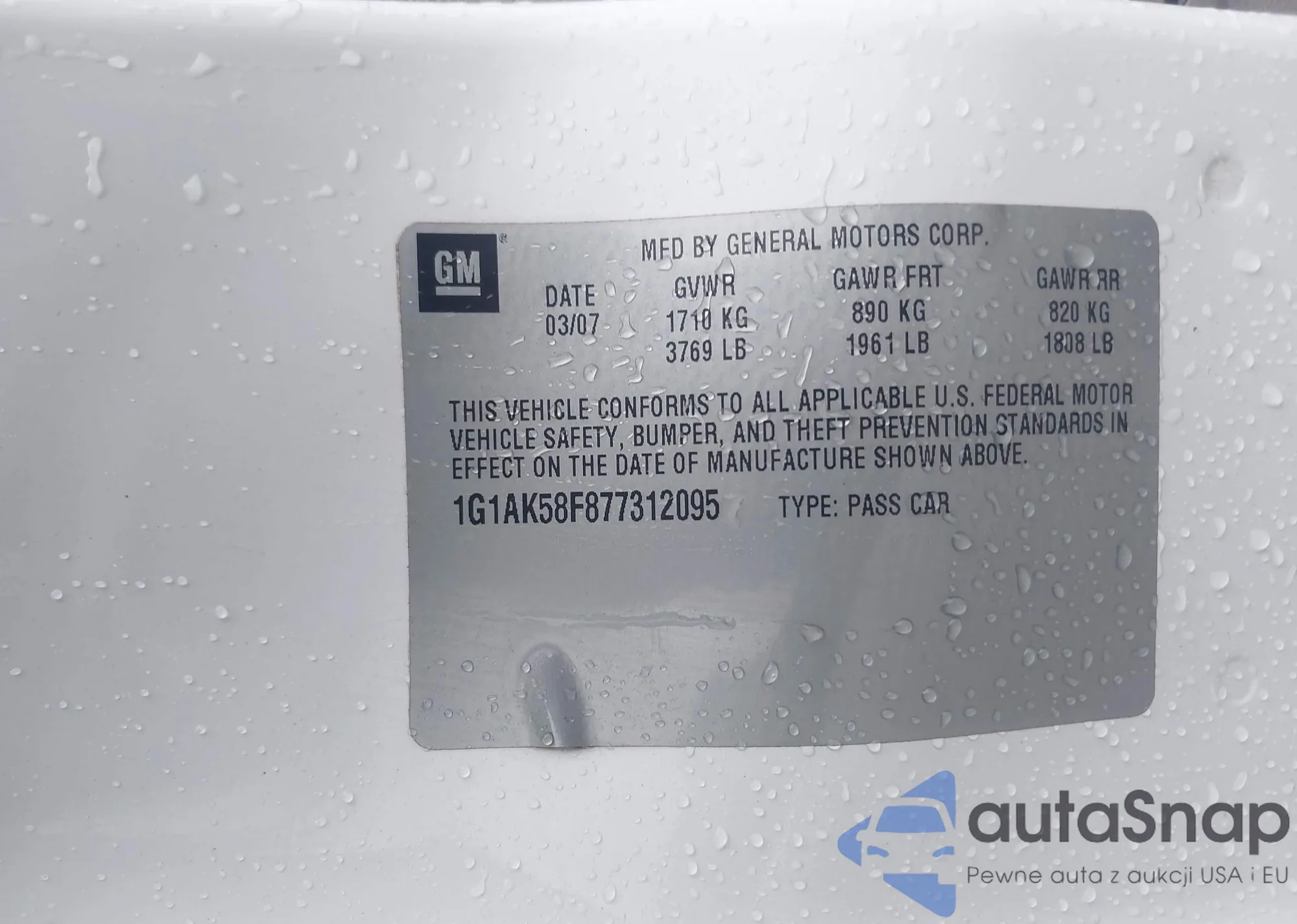 LOT: 42652787 VIN: 1G1AK58F877312095