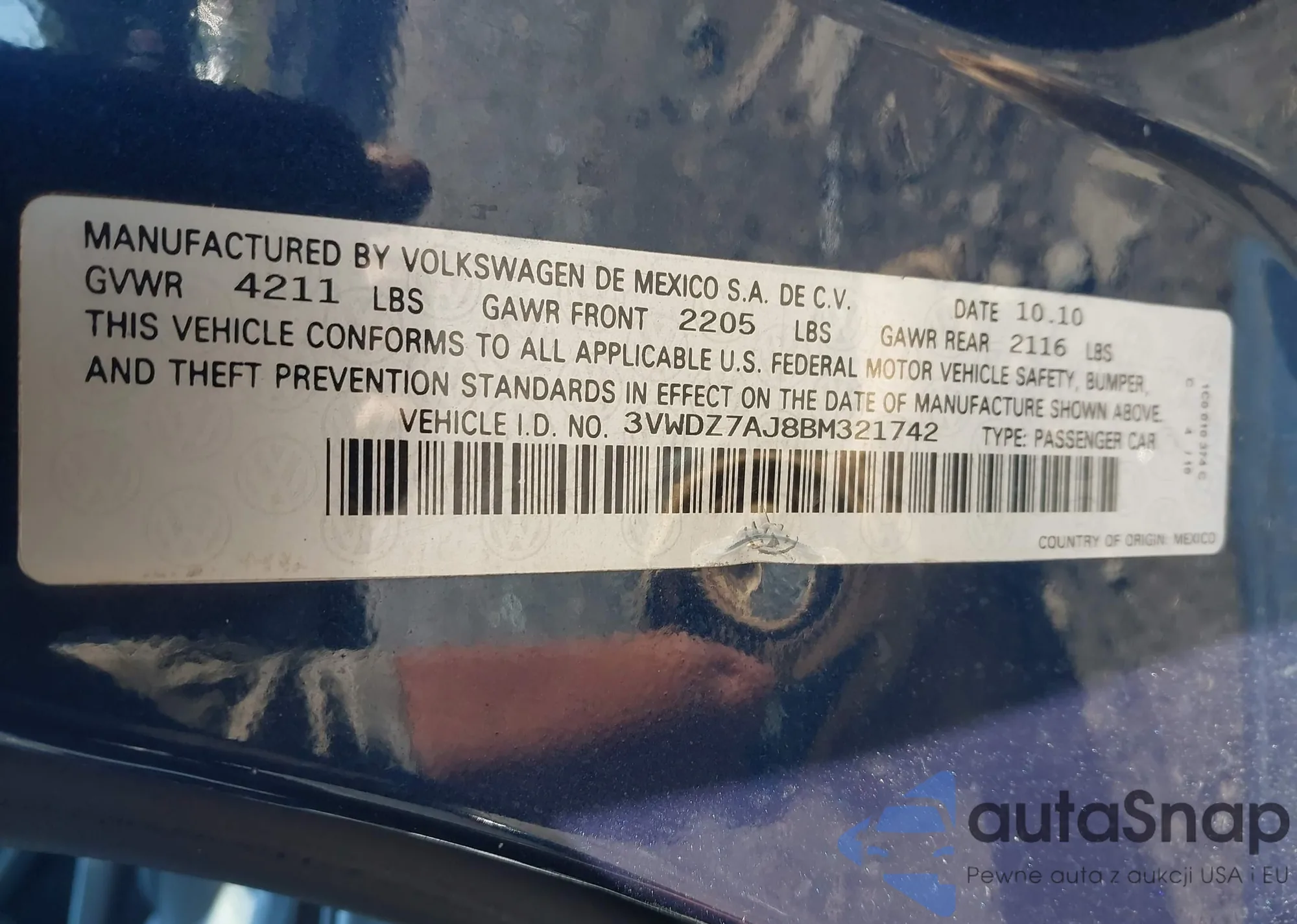 • VIN 3FADP4FJ3BM106291