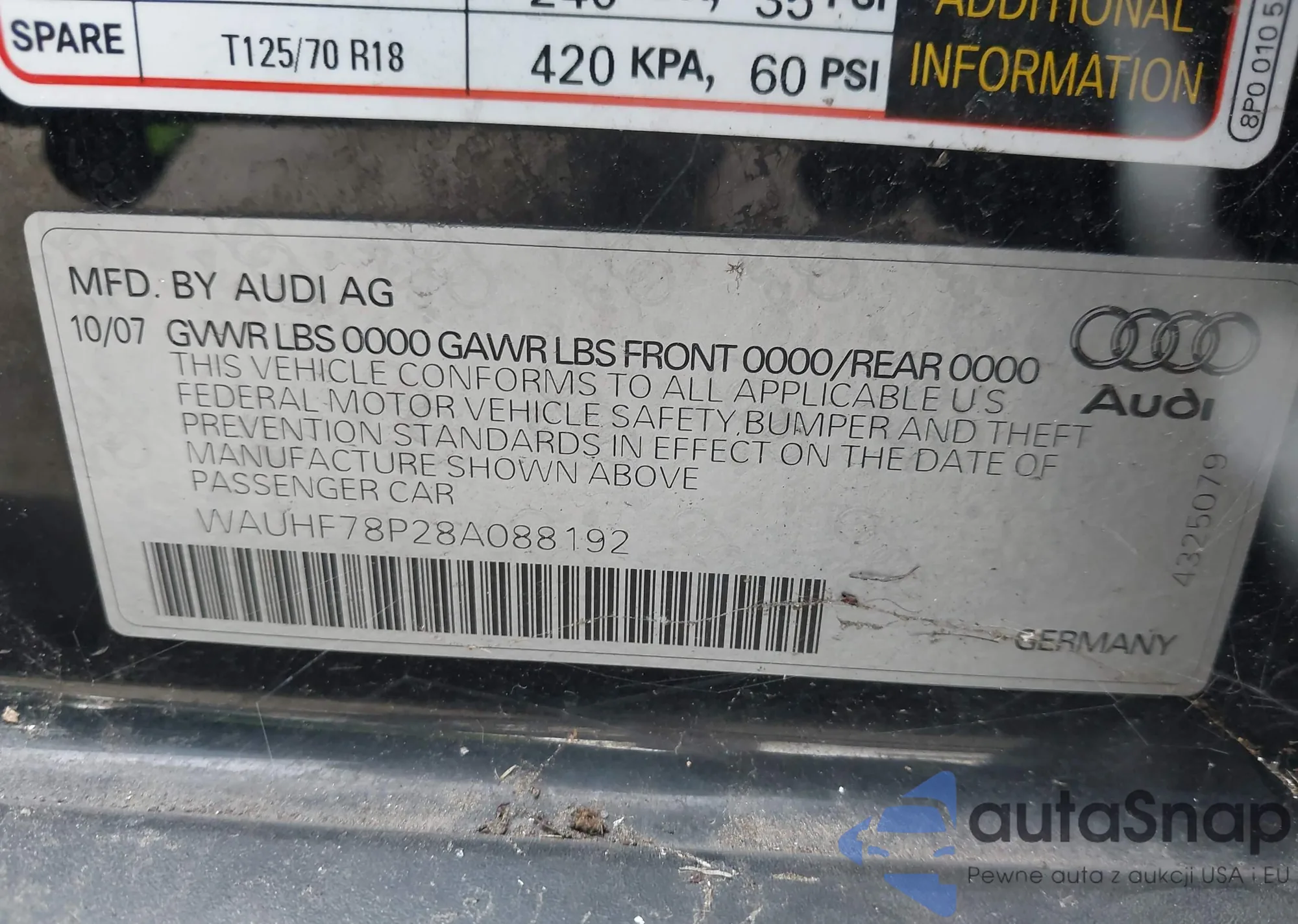 LOT: 43107811 VIN: WAUHF78P28A088192