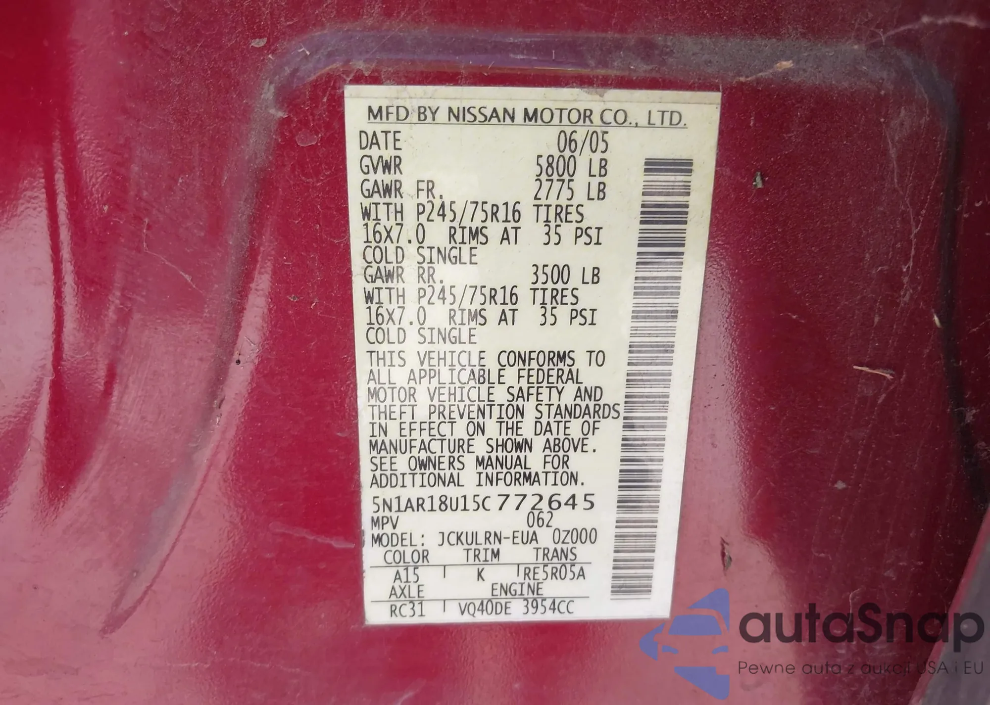 • VIN 5N1AR18U15C772645