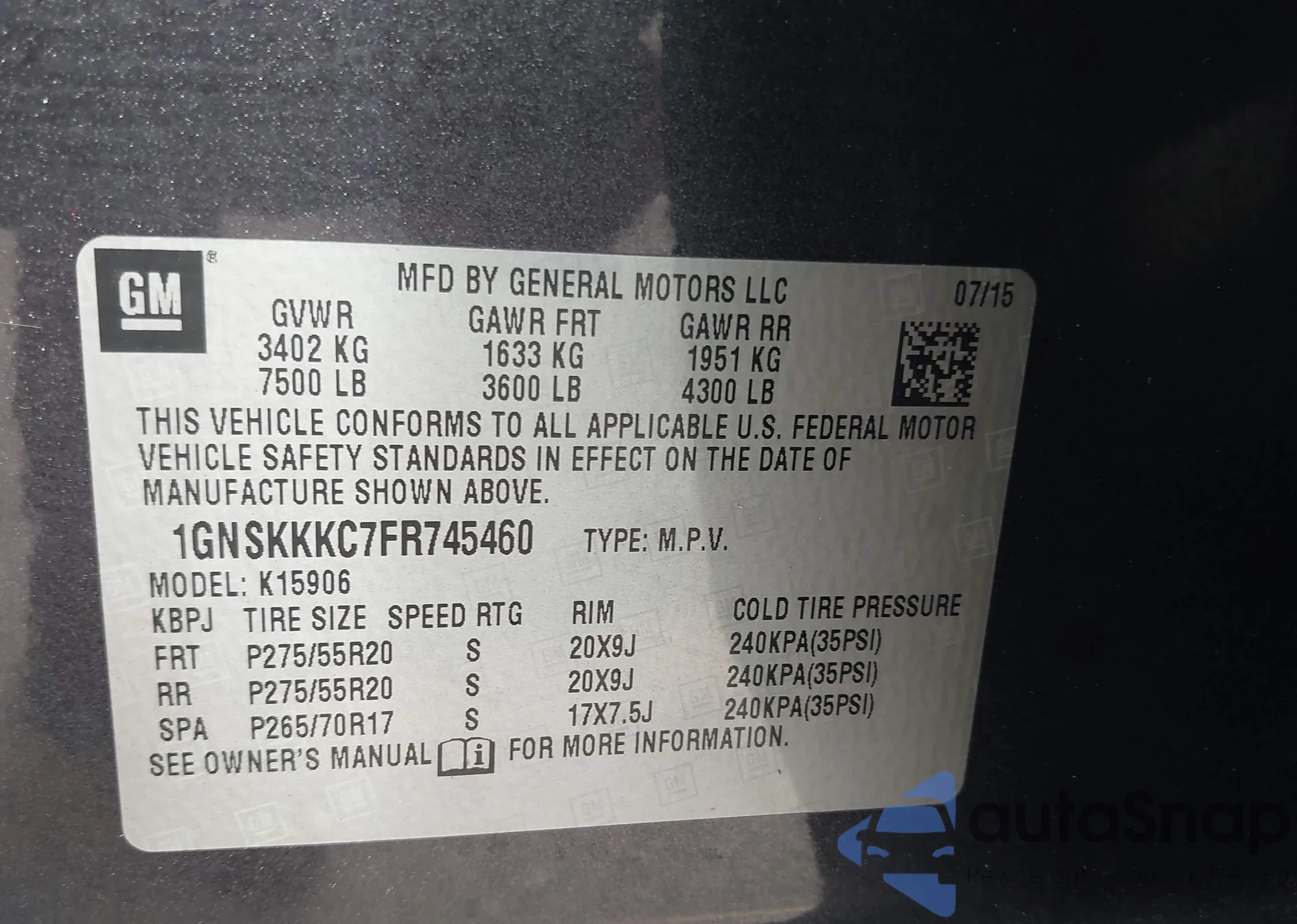 LOT: 43253699 VIN: 1GYKNCRS7NZ106670