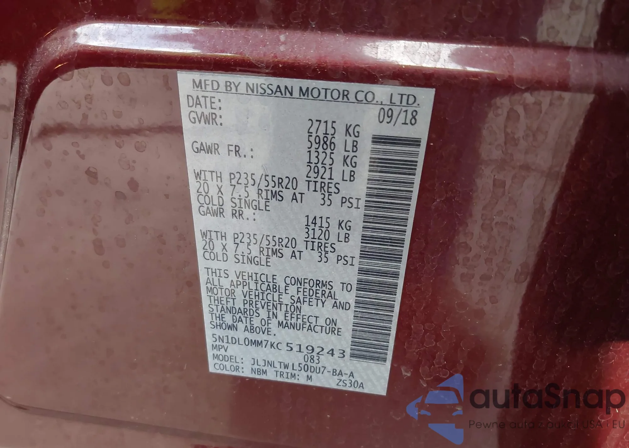 • VIN 5N1DL0MM7KC519243