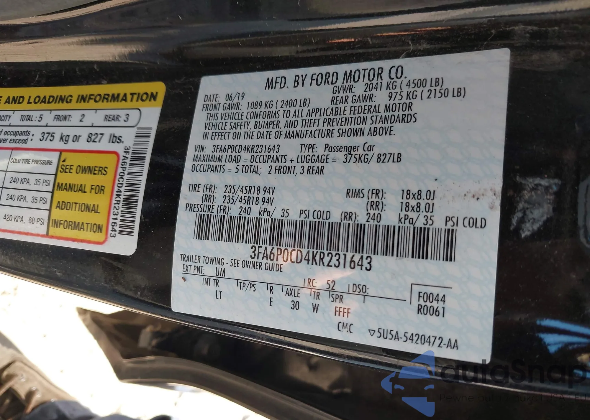LOT: 43454941 VIN: 3FA6P0CD4KR231643