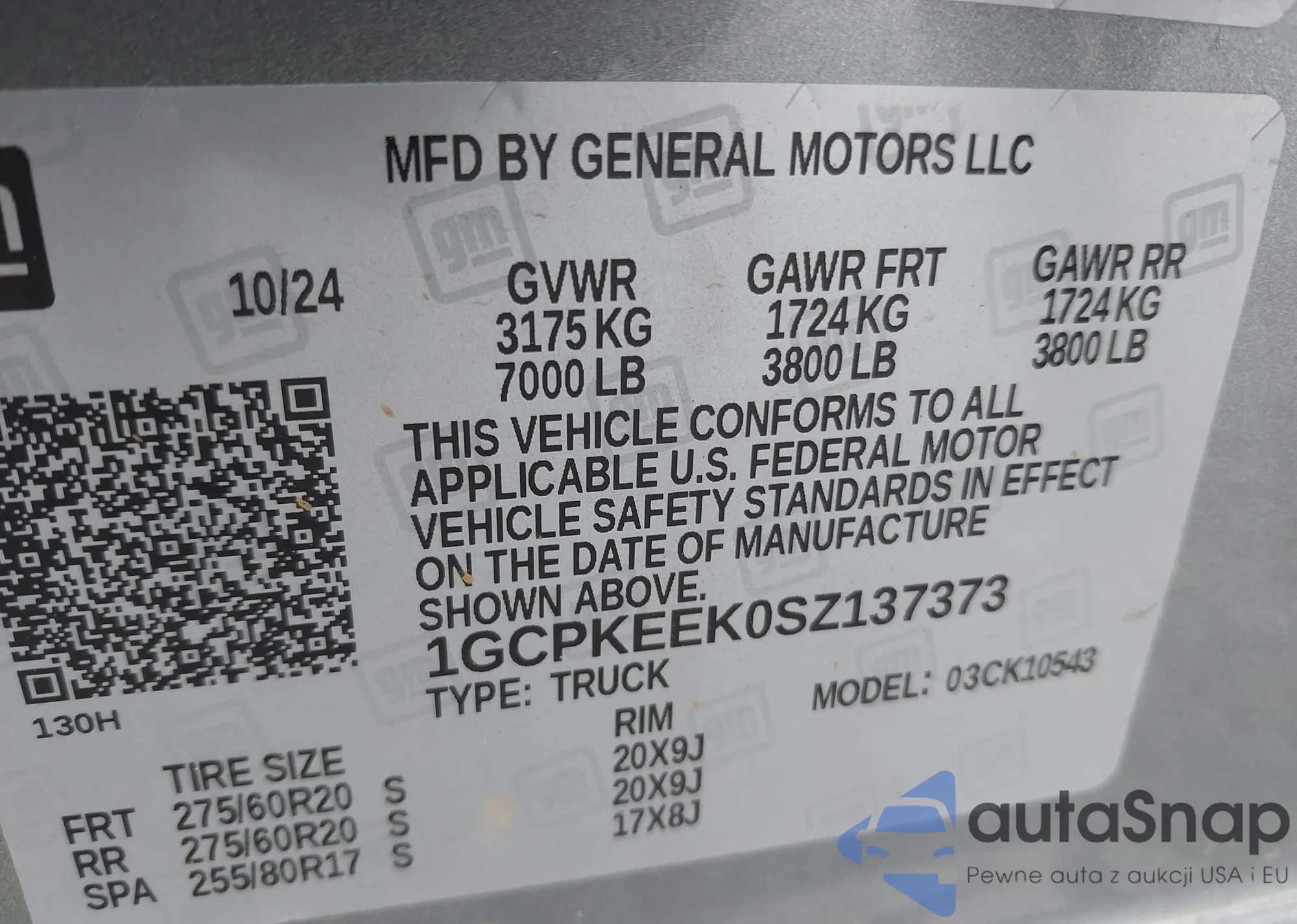 LOT: 43377390 VIN: 1GCPKEEK0SZ137373