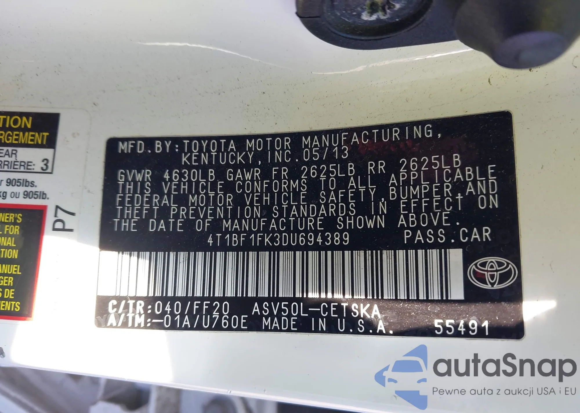 • VIN 4T1BF1FK3DU694389