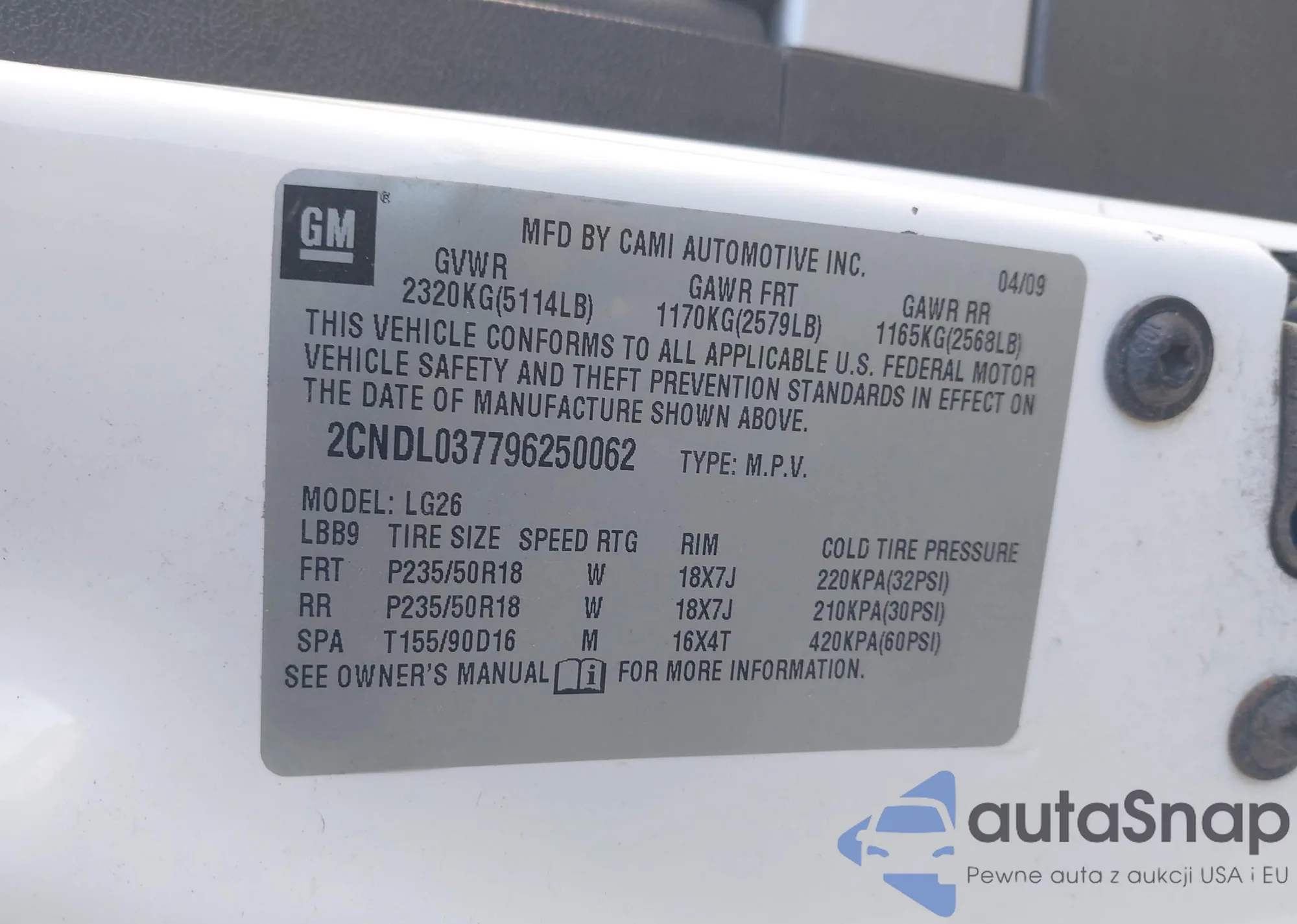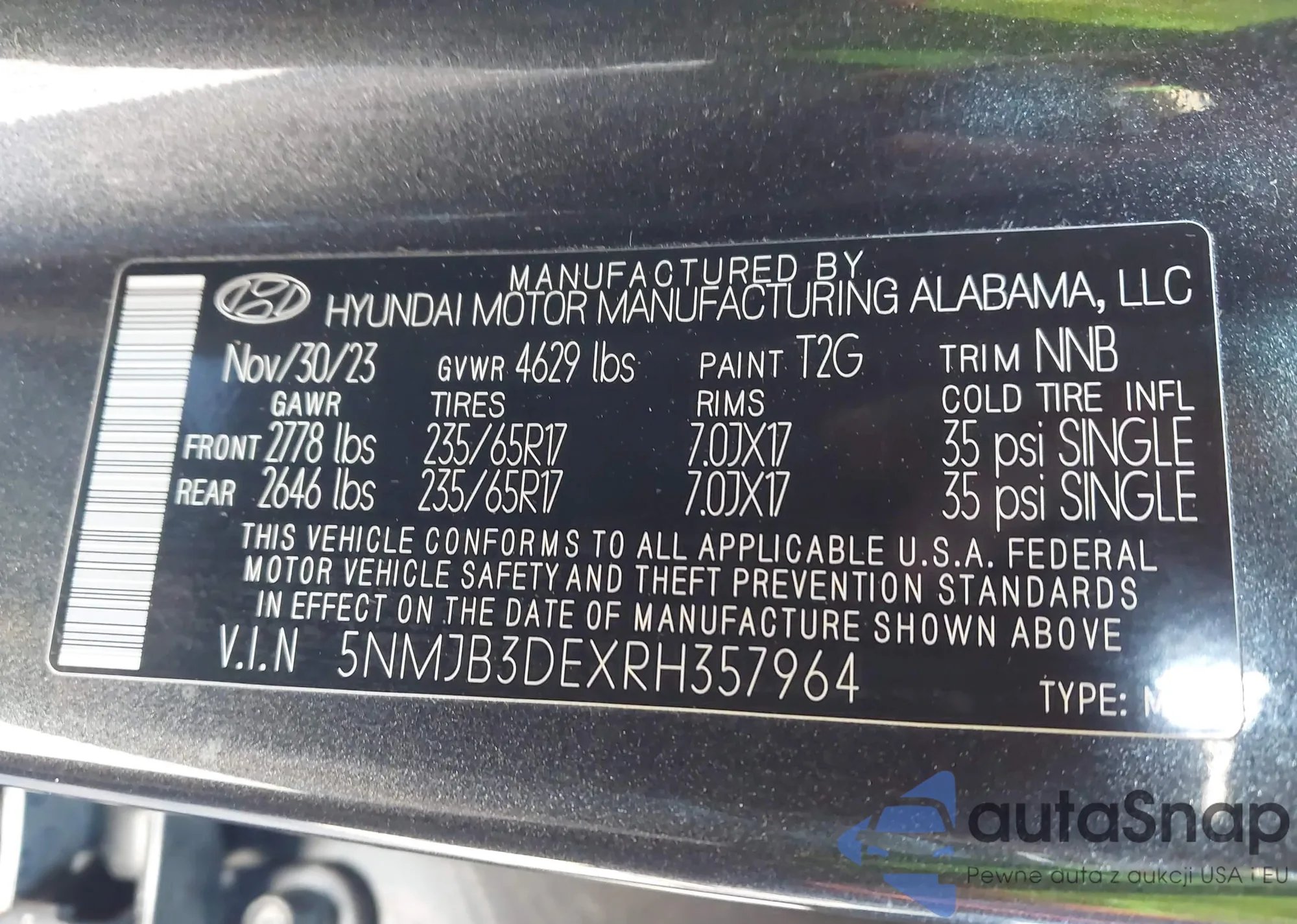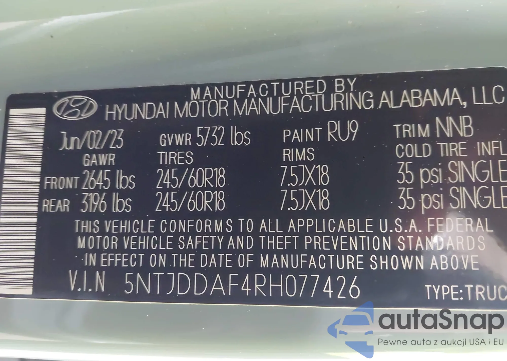 LOT: 43574832 VIN: 5NMSH13E09H238247