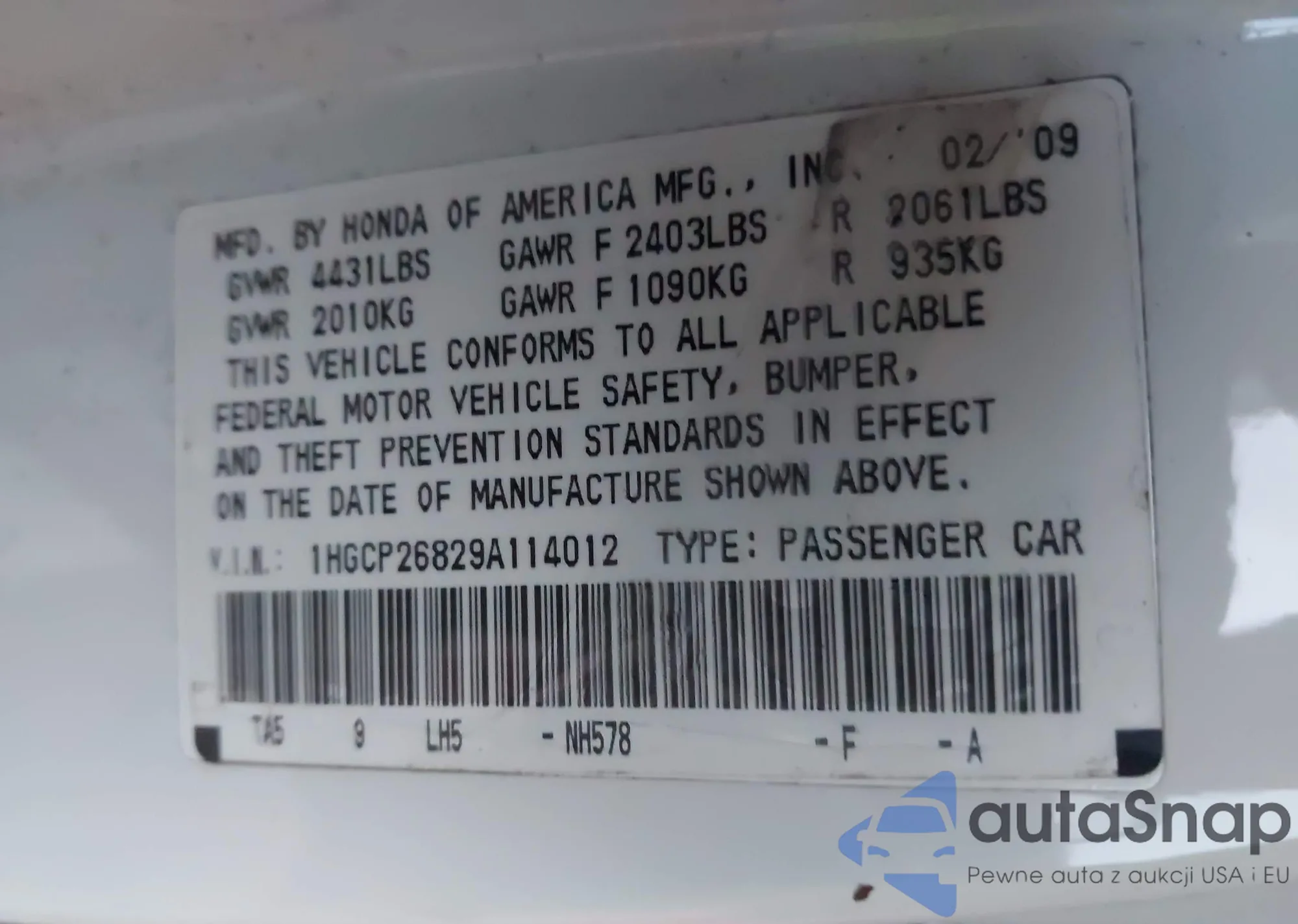 LOT: 43835337 VIN: 1HGCP26829A114012