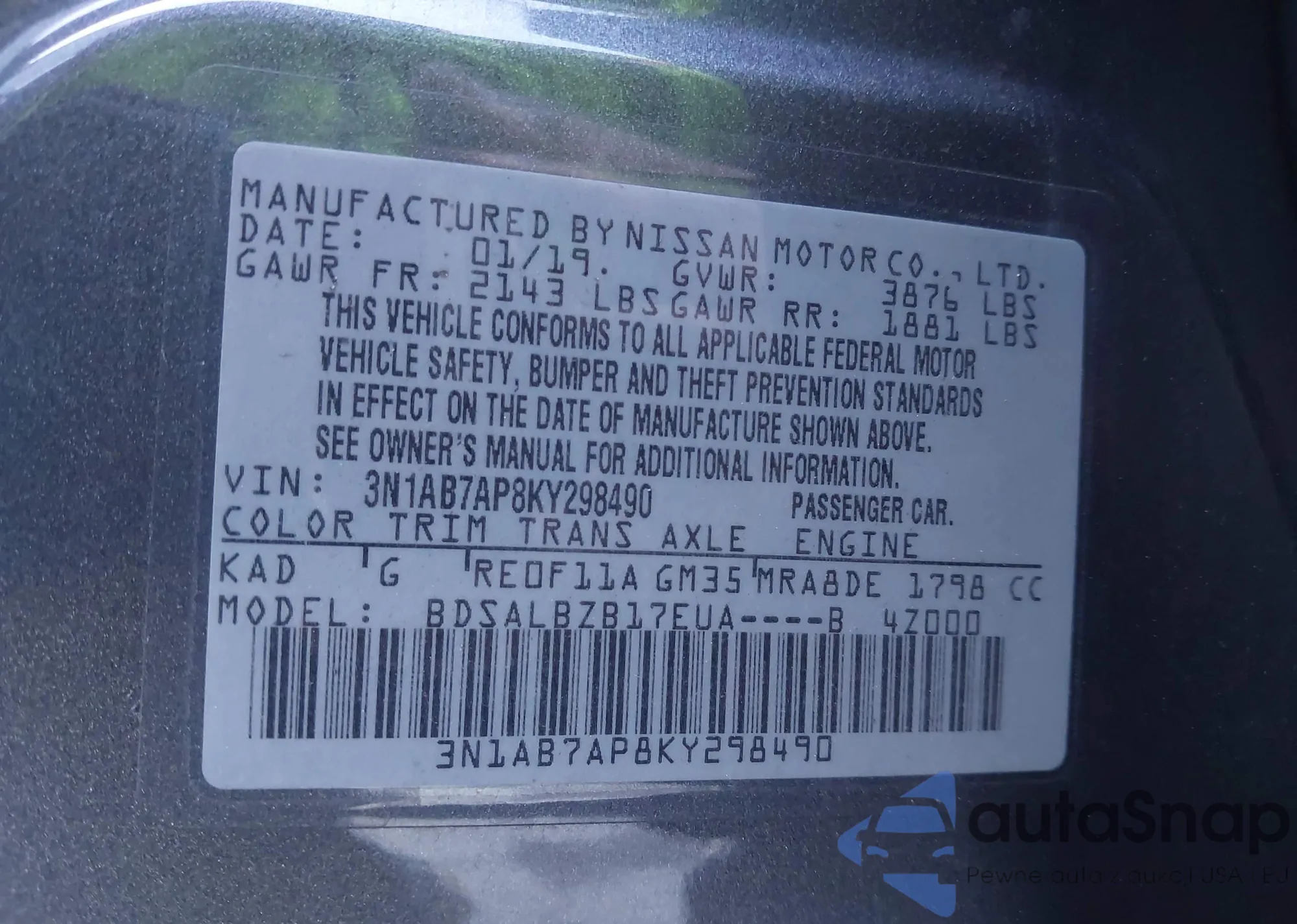 • VIN 3N1AB7AP8KY298490