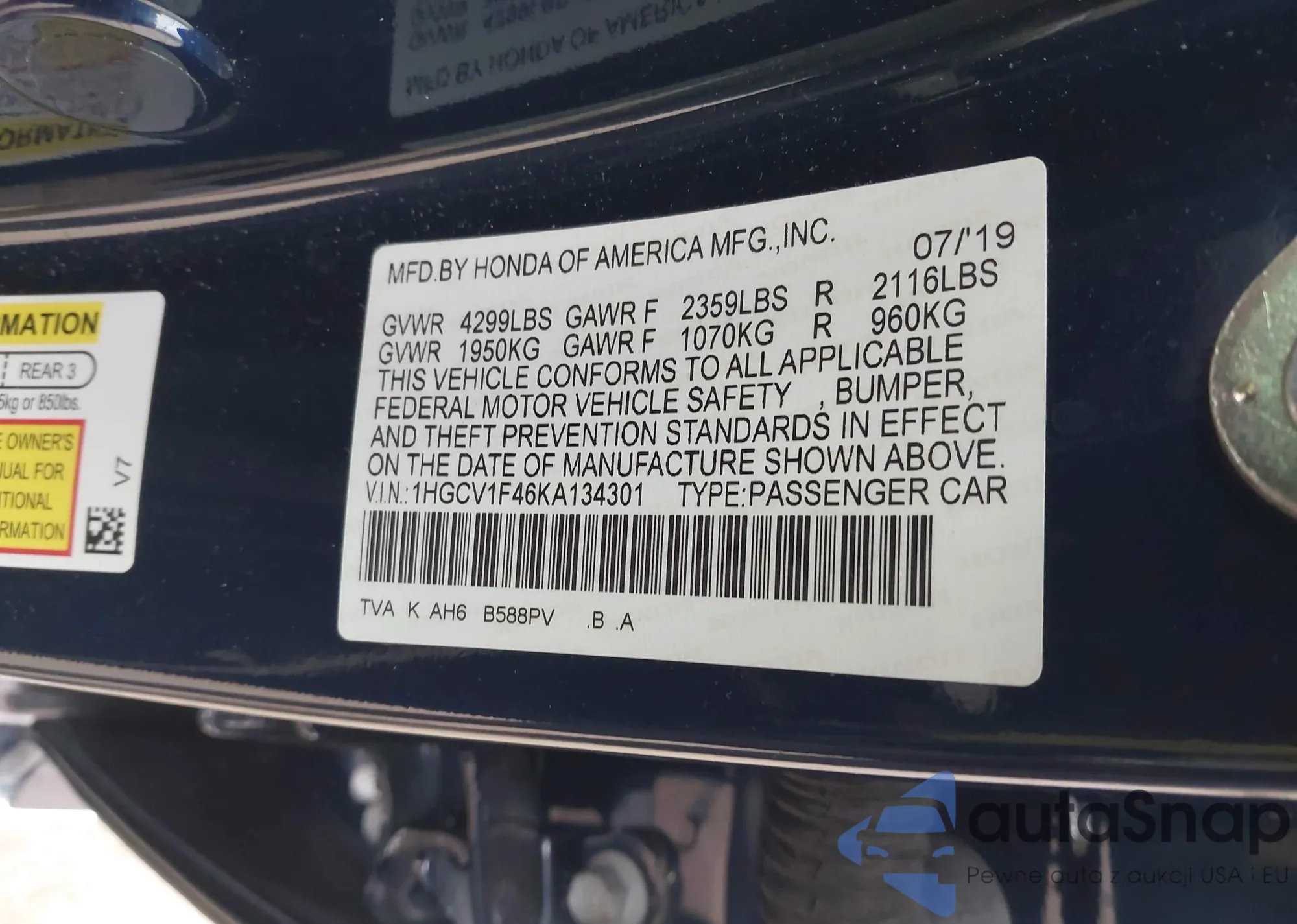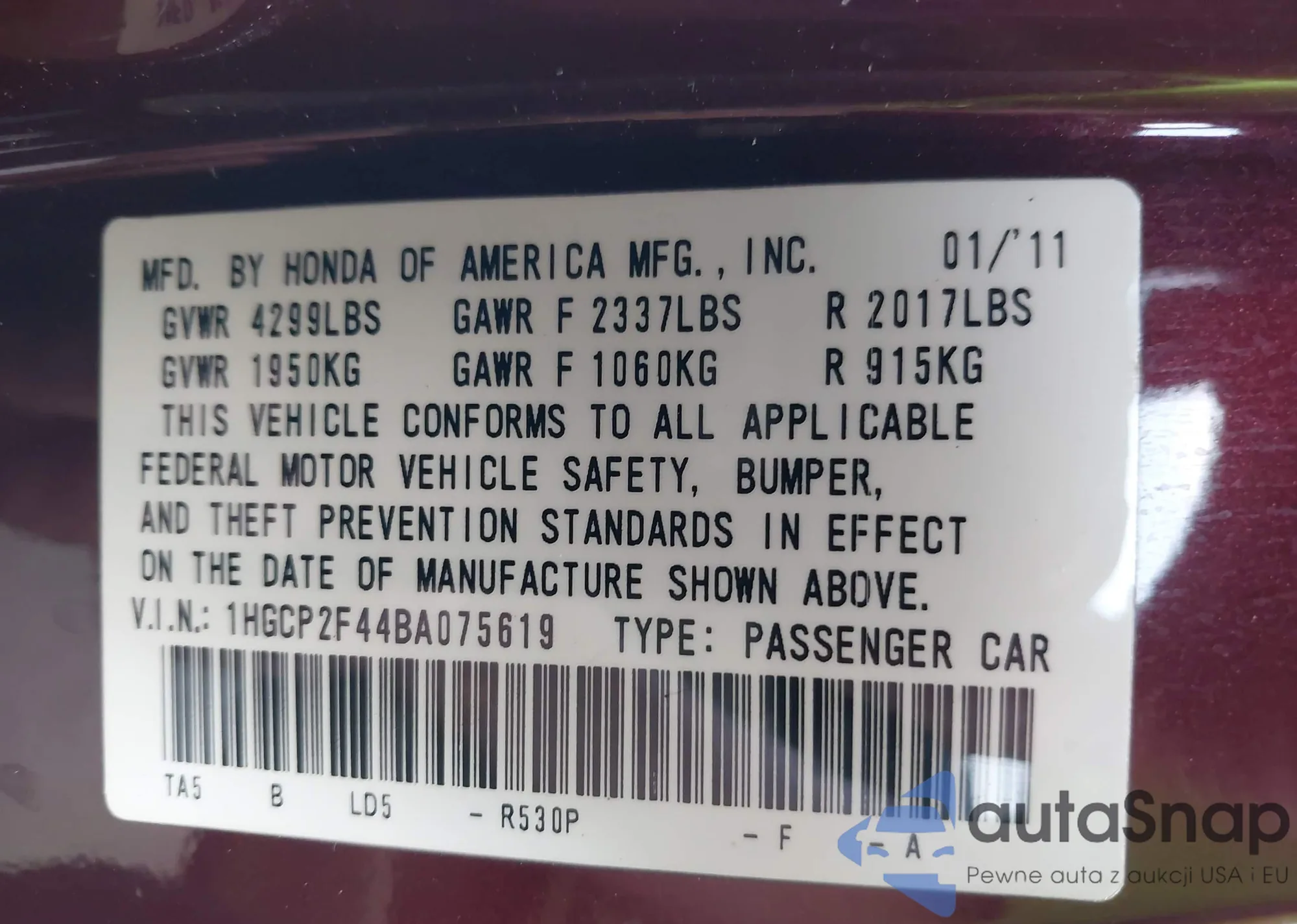 LOT: 43565518 VIN: 1HGCP2F44BA075619