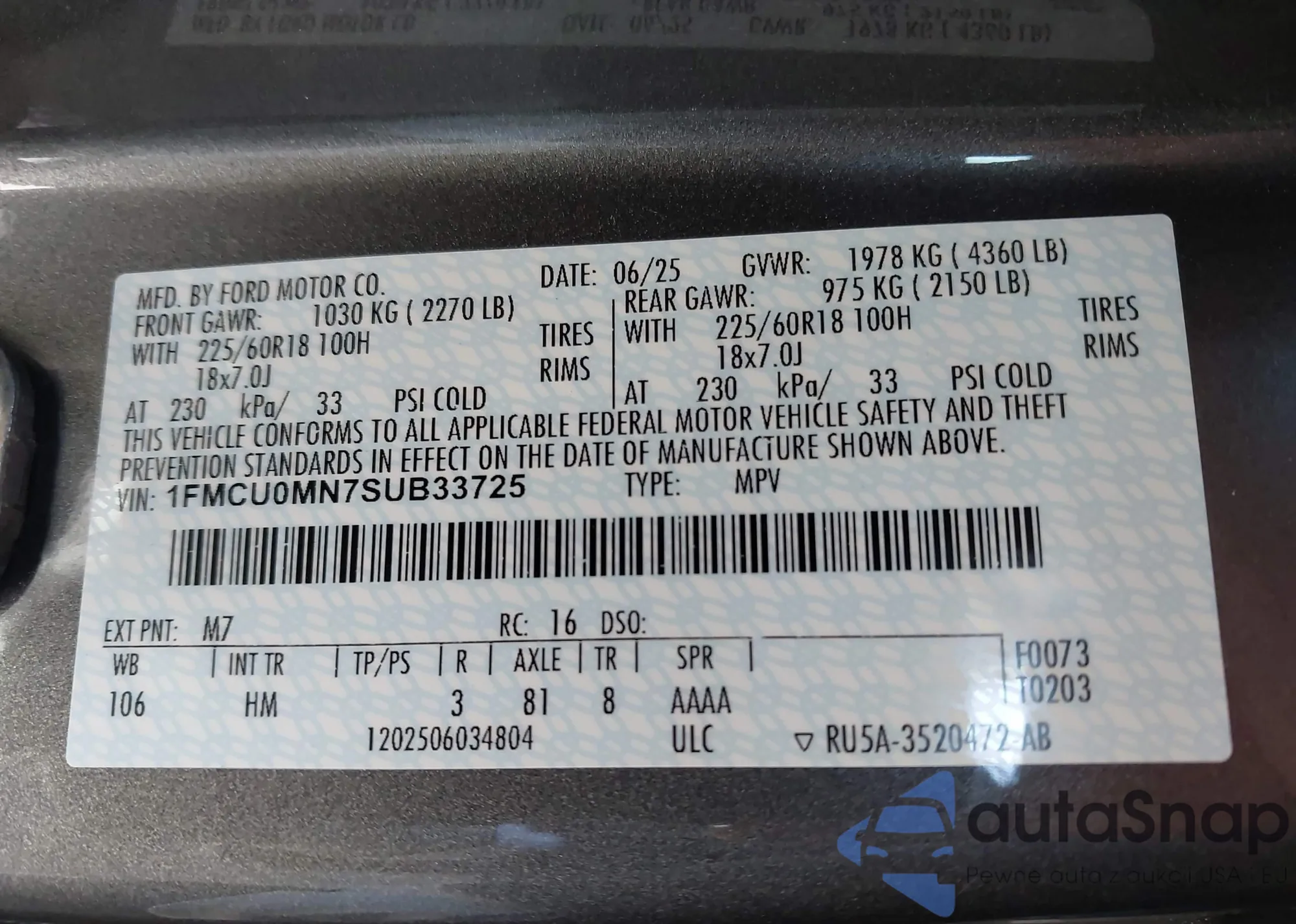 • VIN 1FMCU0MN7SUB33725