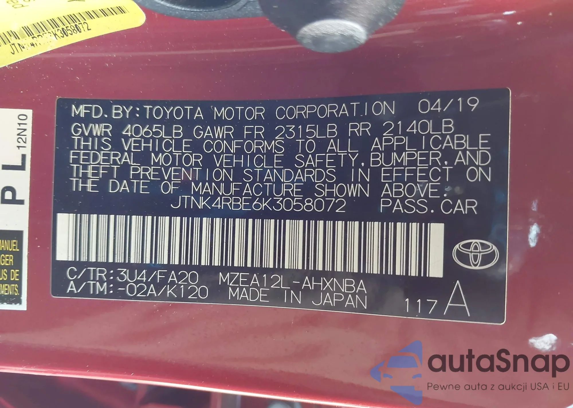 LOT: 43646535 VIN: JTNK4RBE6K3058072