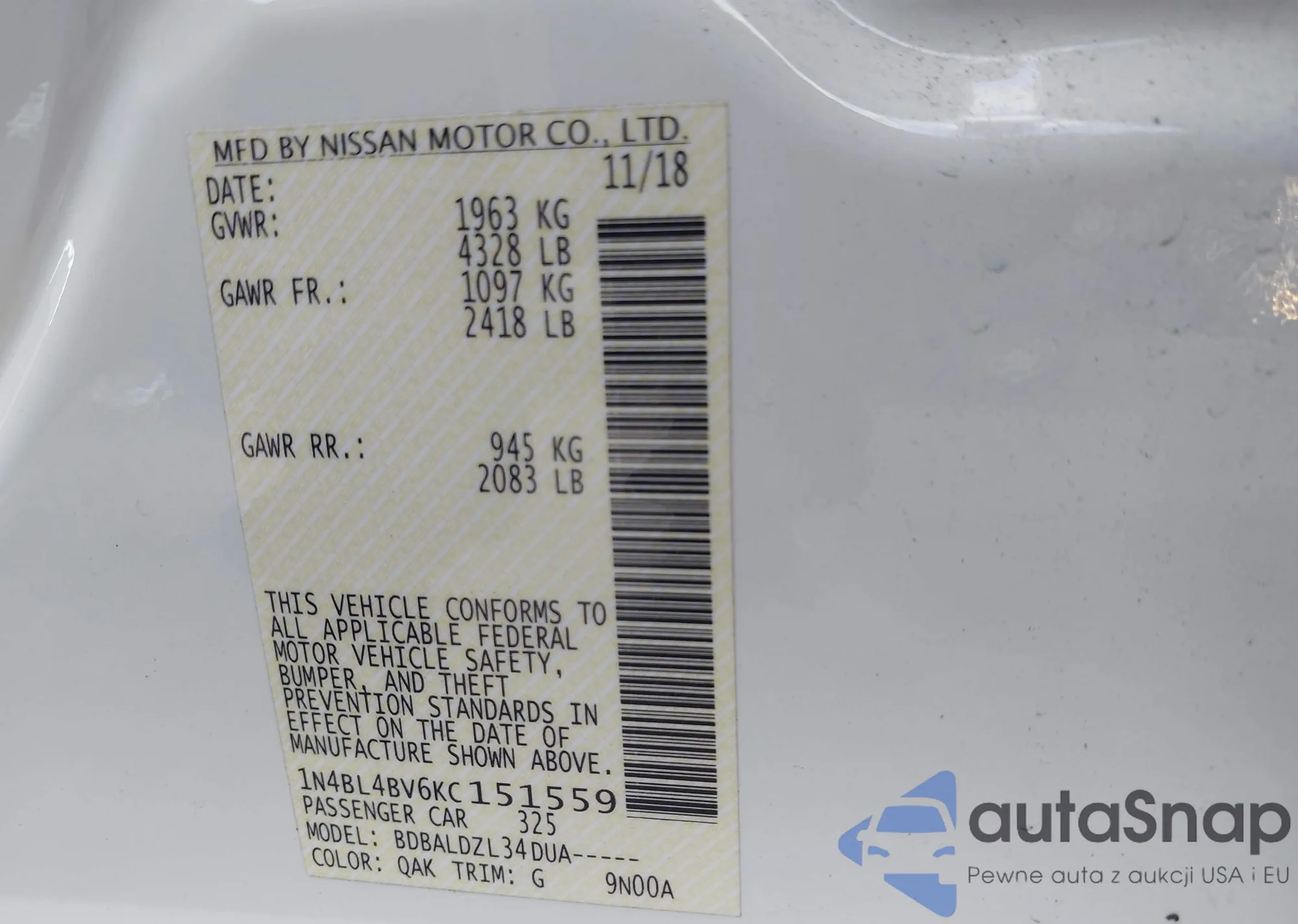 LOT: 43671375 VIN: 1N4BL4BV6KC151559