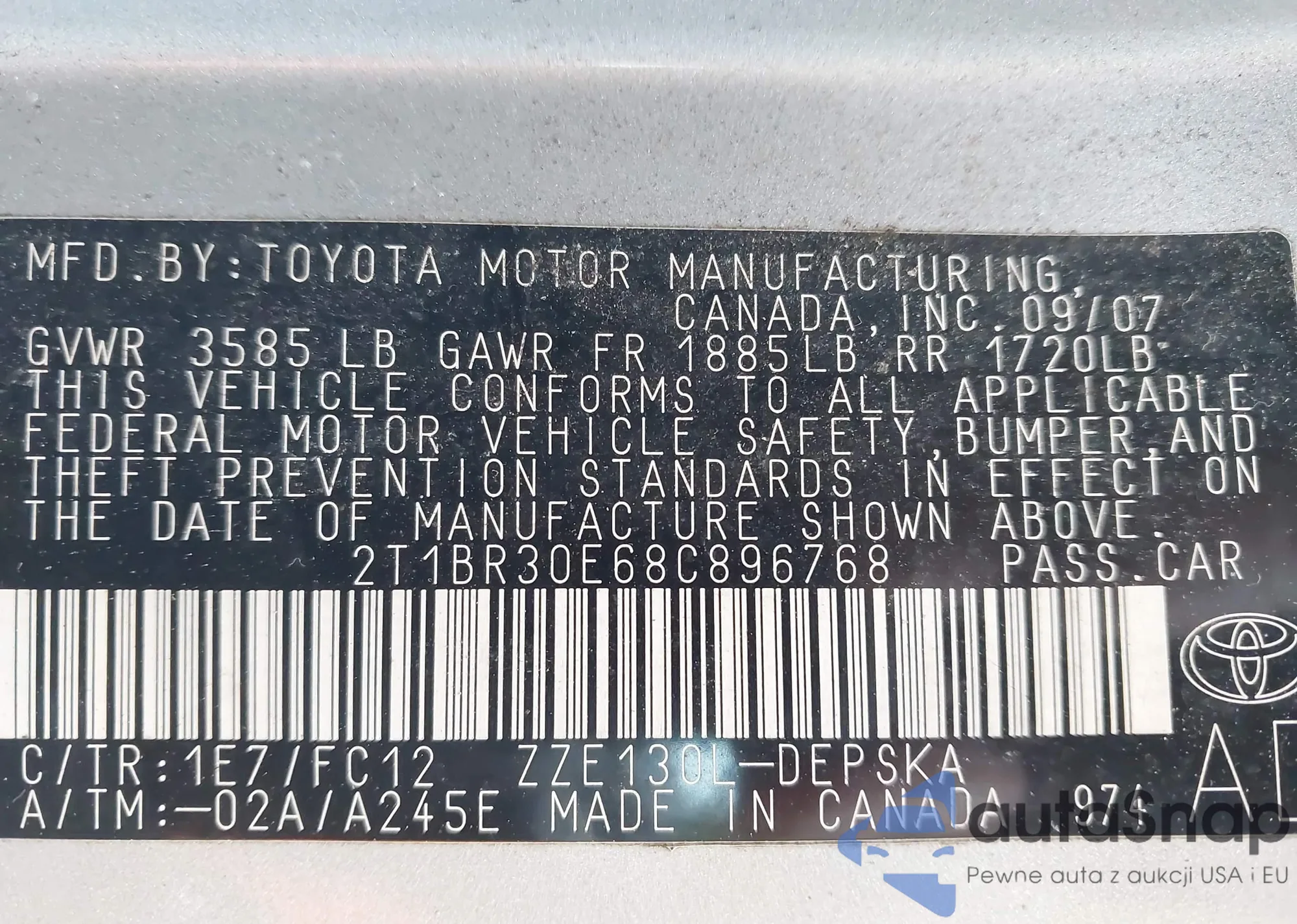 LOT: 43686568 VIN: 2T1BR30E68C896768